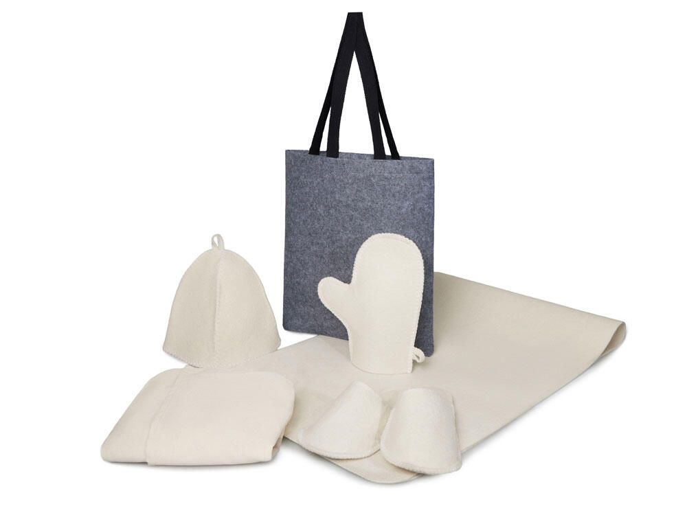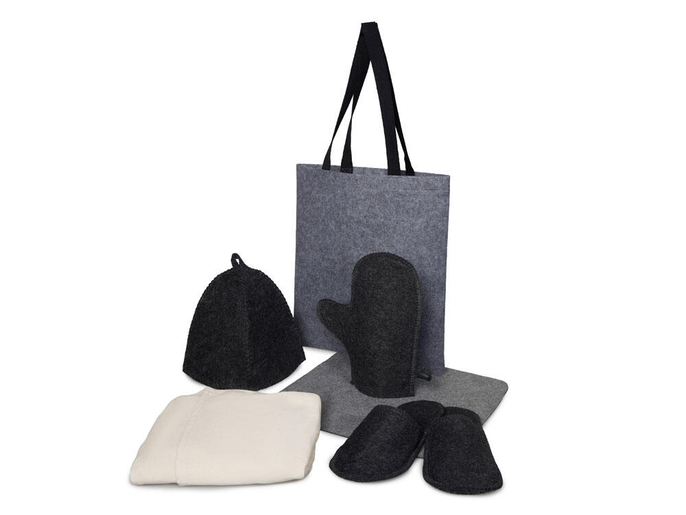 Женский банный набор "Healing" для комфортного отдыха: лежак для бани, холщовый килт-парео, рукавица, шапка и тапочки — всё аккуратно упаковано в стильный фетровый шоппер.