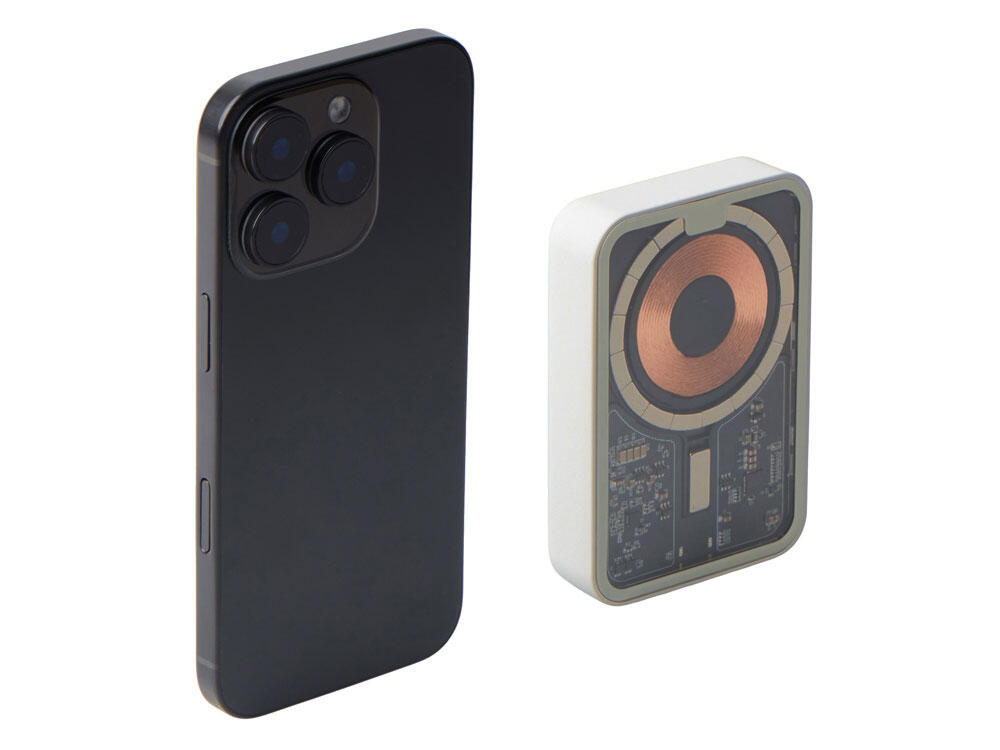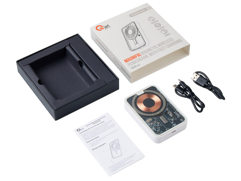 Беспроводной магнитный внешний аккумулятор MagnifIQ — технологичный и стильный power bank с эффектной прозрачной передней панелью, сквозь которую видны мощные магниты, индукционная катушка и электронная начинка. Ёмкость 10 000 мА·ч обеспечивает до 2–3 полных зарядов смартфона, а поддержка быстрой беспроводной зарядки до 15 Вт (с совместимостью QC/PD) делает процесс зарядки максимально быстрым и удобным. Двунаправленный USB-C порт позволяет как заряжать другие устройства, так и сам аккумулятор. Обе стороны корпуса подходят для нанесения логотипа: лицевая — через прозрачную панель, задняя — на приятное на ощупь soft-touch покрытие. Компактный, надёжный и сильный — идеальный технологичный продукт для продвижения и ежедневного использования. Поставляется в качественной упаковке с шубером, Двунаправленный кабель USB-C и кабель USB-A – USB-C в комплекте.