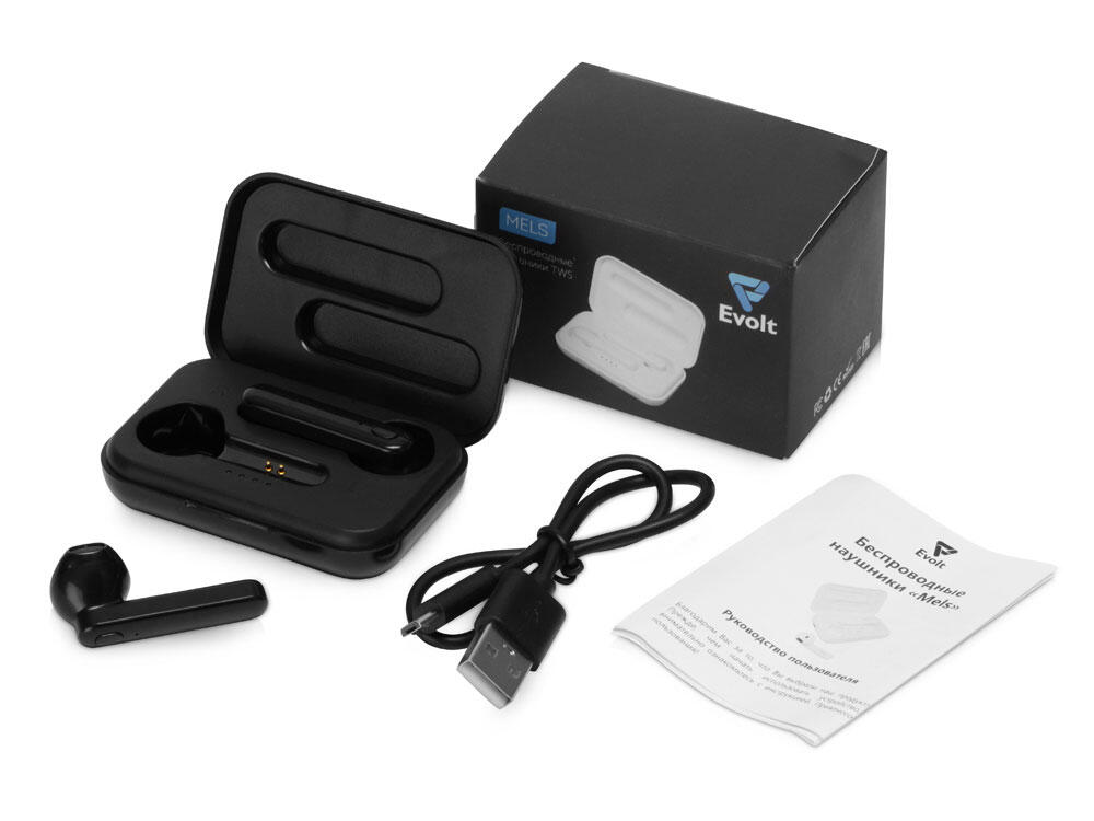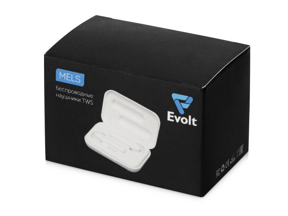 Беспроводные наушники «Mels» бренда Evolt обеспечивают до 16 часов суммарного воспроизведения музыки и работают на расстоянии до 10 метров от сопряженного с ним смартфона или иного гаджета. Зарядный чехол имеет разъем mini USB, внутри которого есть шкала заряда, состоящая из четырех делений.