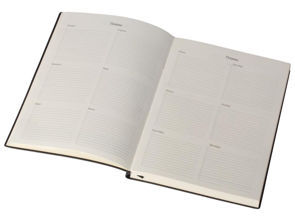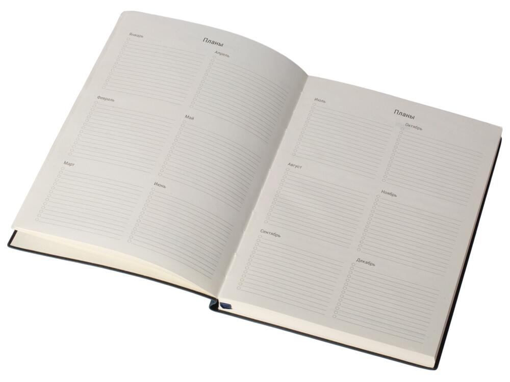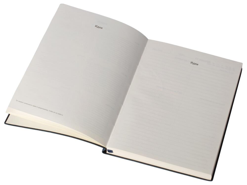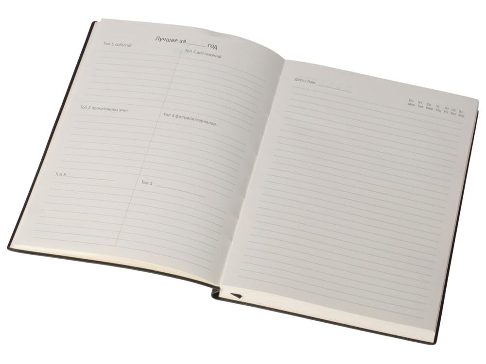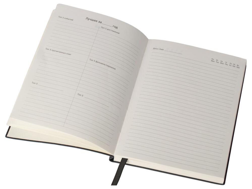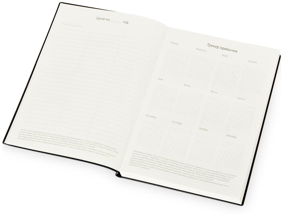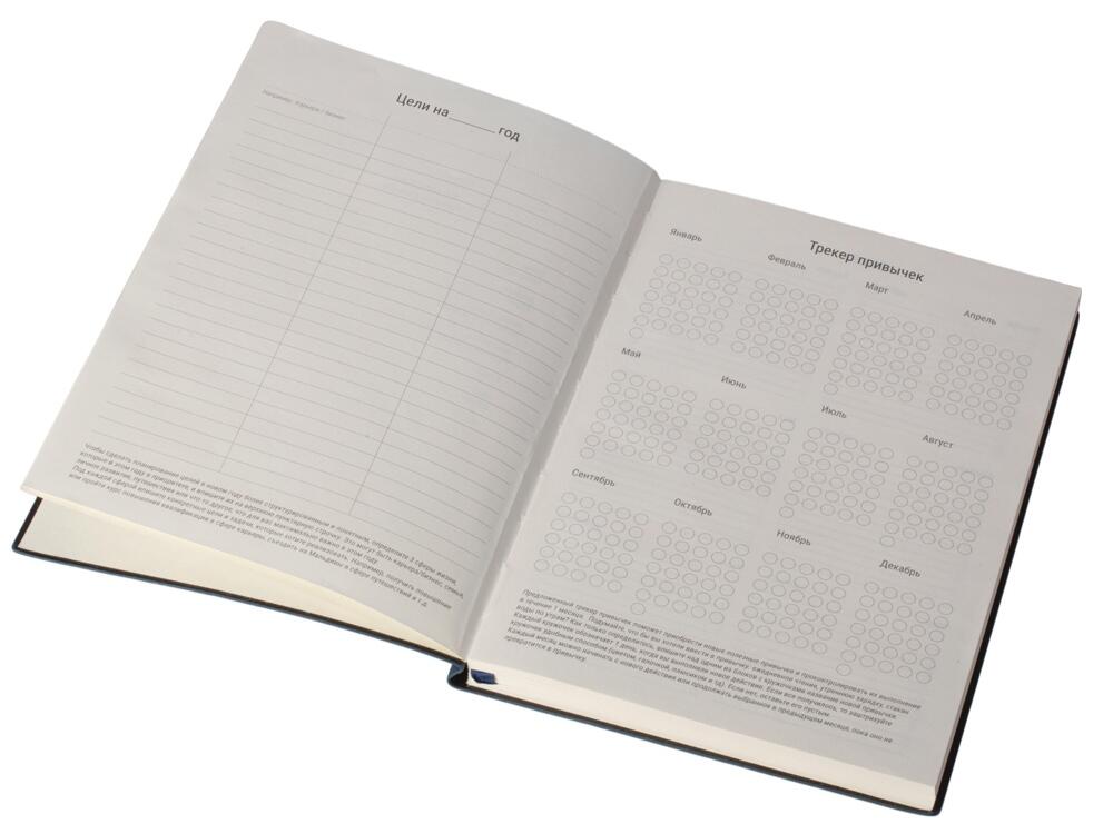 Бумажный блок выполнен из бумаги, полученной из древесины из специальных восполняемых лесных ресурсов, имеет сертификат FSC, международной некоммерческой организации лесного попечительского совета. Линовка — недатированный ежедневник, а на первых страницах вы встретите специальные листы для постановки целей на год и подведения итогов, а также другие трекеры.