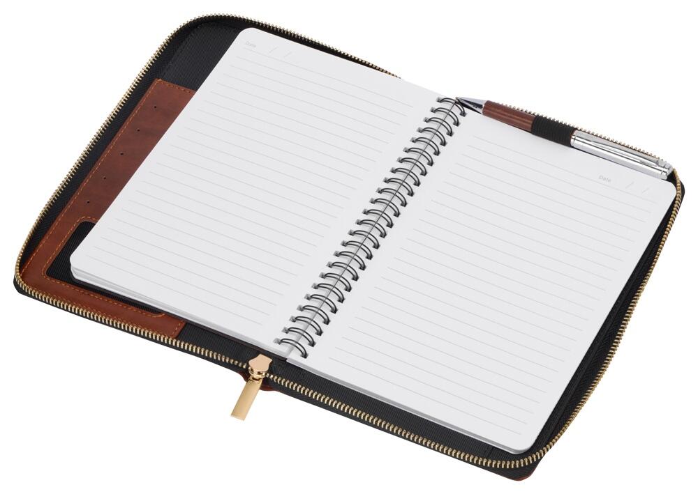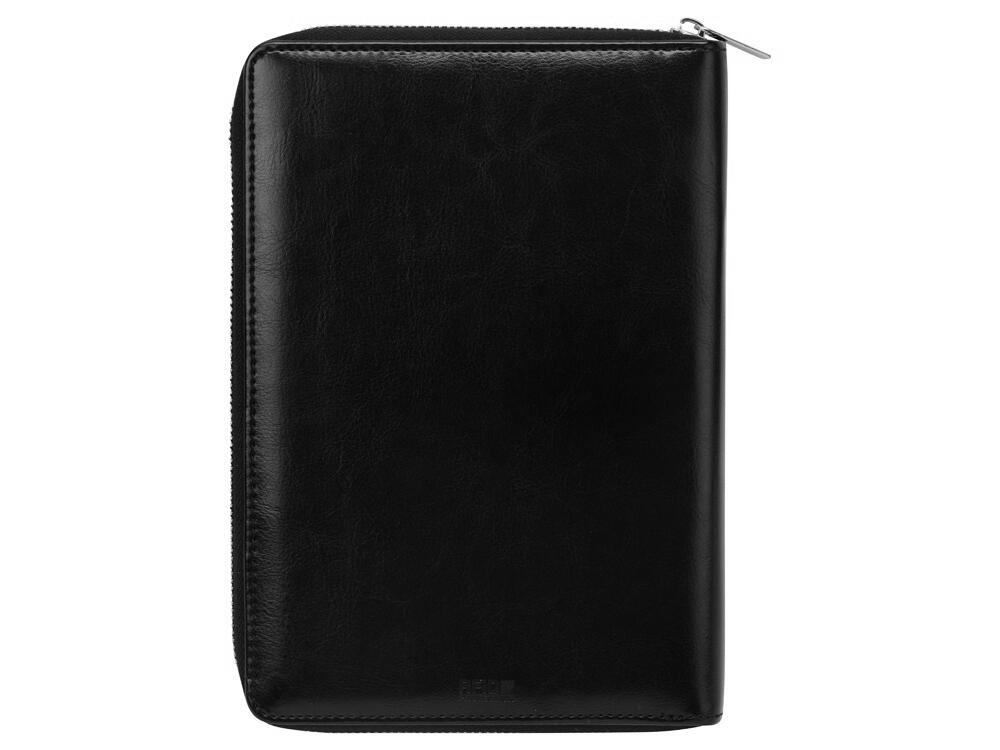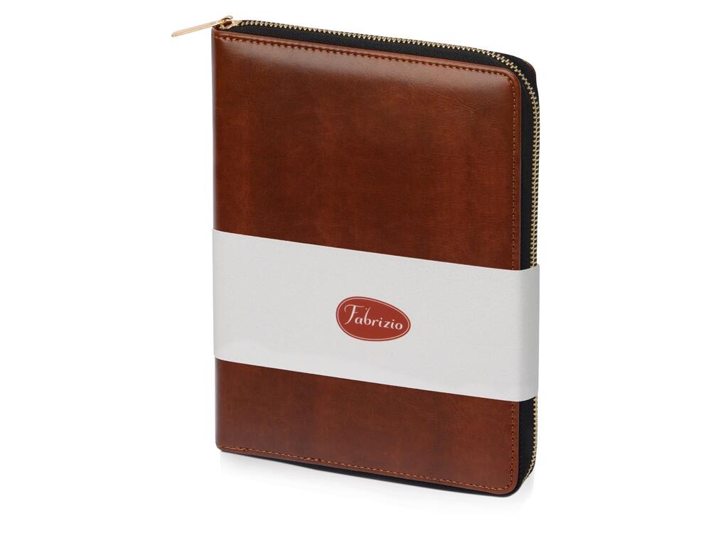 Бизнес блокнот Fabrizio состоит из пенала на молнии выполненного из искусственной кожи, и сменной тетради на 80 листов на кольцах с перфорированными линованными листами белого цвета.