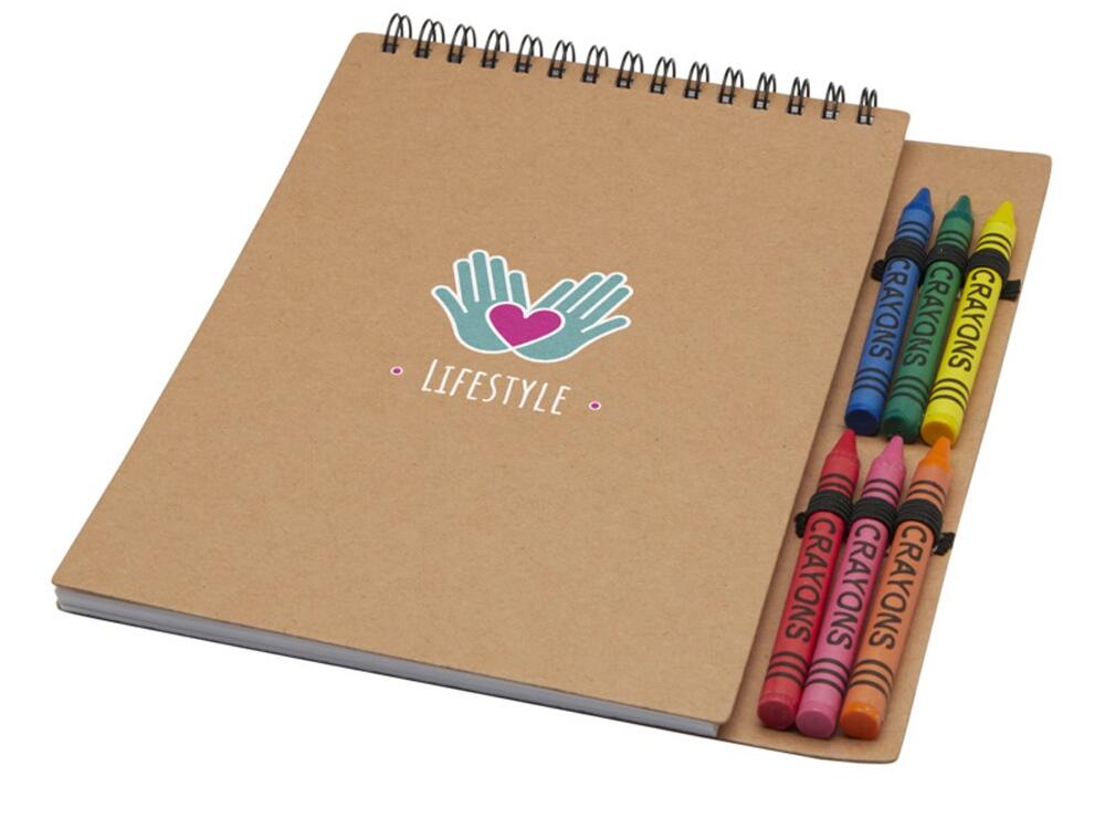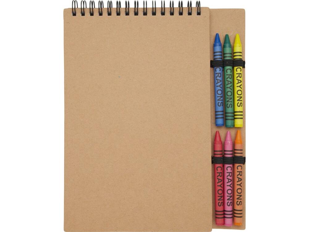 Набор Doodle из блокнота на спирали формата А5 в мягкой обложке и цветных восковых карандашей содержит 50 нелинованных листов бумаги плотностью 70 г/м². Блокнот имеет закругленные углы и петлю для карандаша. В набор входят 6 цветных восковых карандашей (синий, зеленый, желтый, красный, розовый, оранжевый). Размер карандаша: 8 x 0,8 см. Внимание! Не подходит для детей младше трех лет.