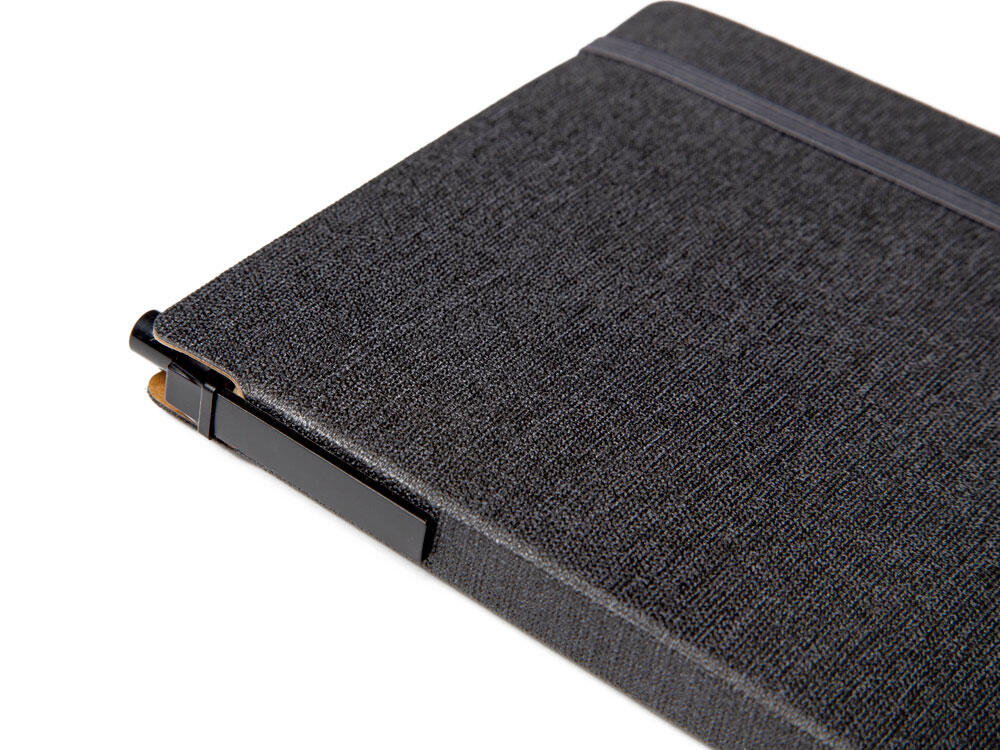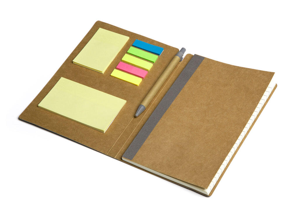 Набор включает в себя разноцветные стикеры разных размеров, блокнот с линованной бумагой и ручку c корпусом из переработанного картона. Обложка выполнена из фактурной искусственной кожи, которая, при тиснении, меняет цвет на более глубокий.