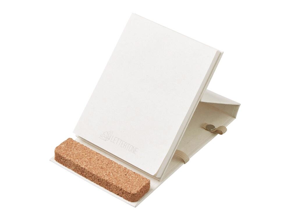 Удобный блокнот-репортер из переработанных тетрапаков с фиксирующей резинкой и петлей для ручки. Пробковое основание может как фиксировать блокнот в стоячем положении, так и стать подставкой для телефона на рабочем столе.