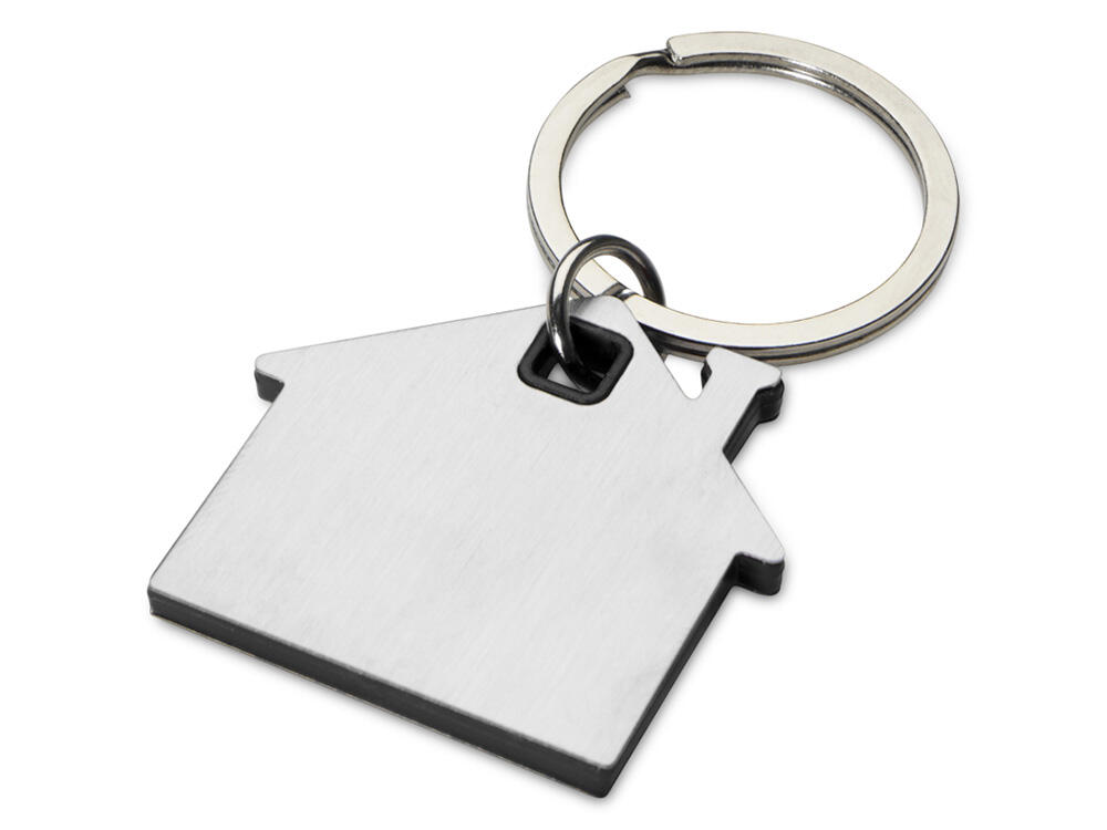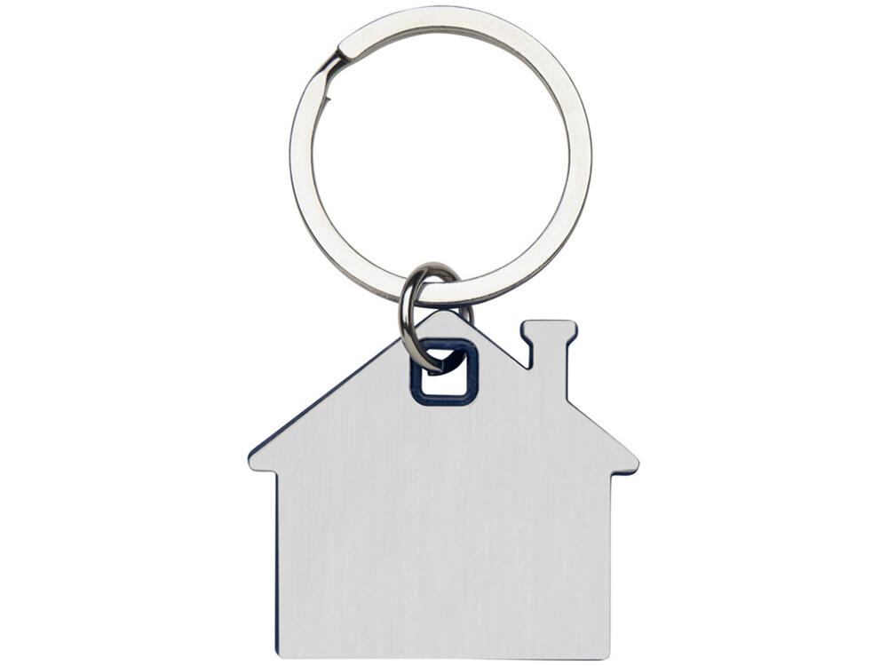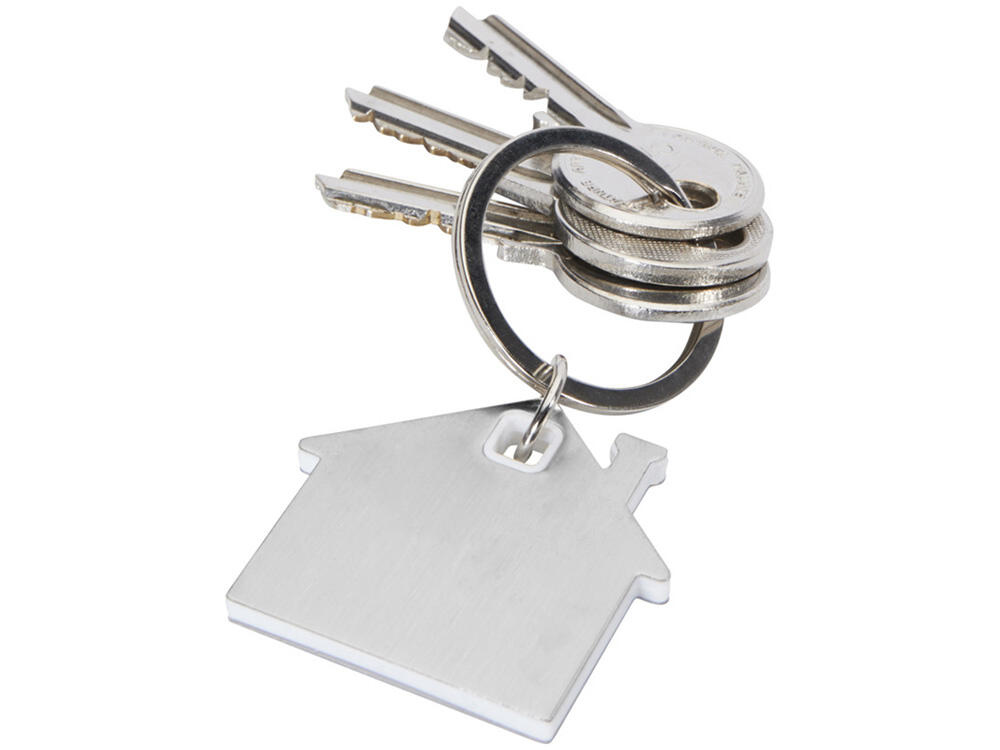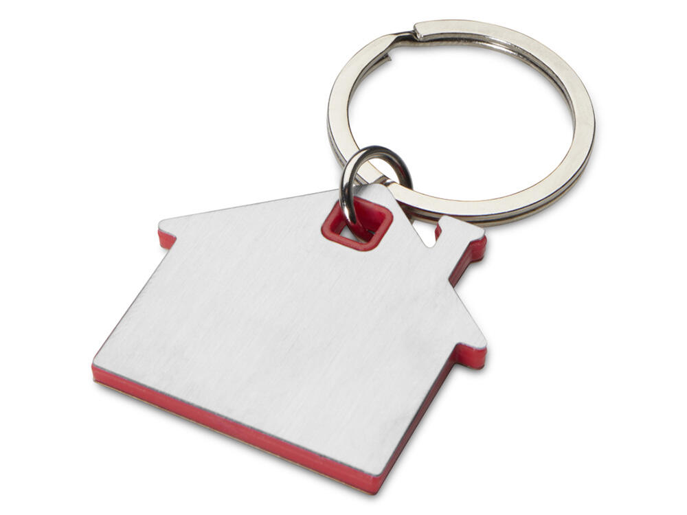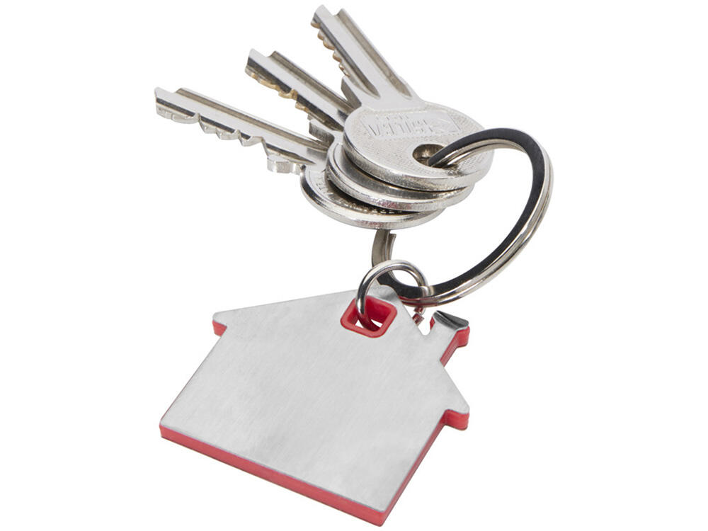 Брелок для ключей в форме домика с цветной вставкой из пластика между 2-мя серебристыми пластинами из стали.