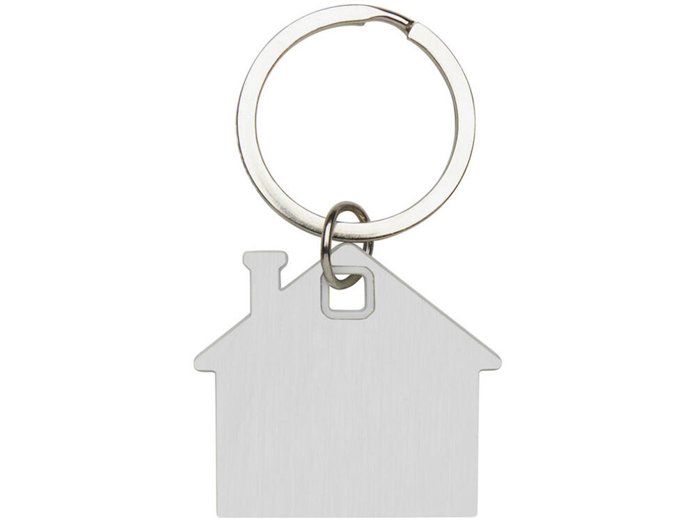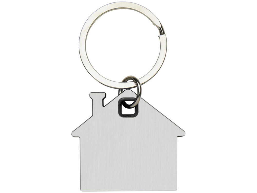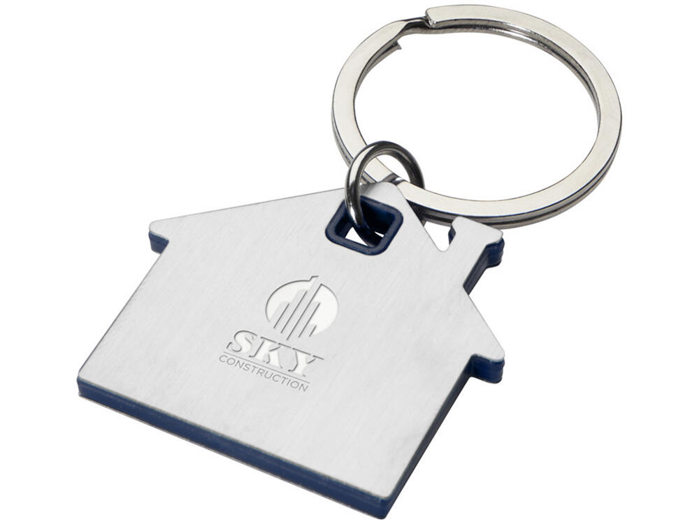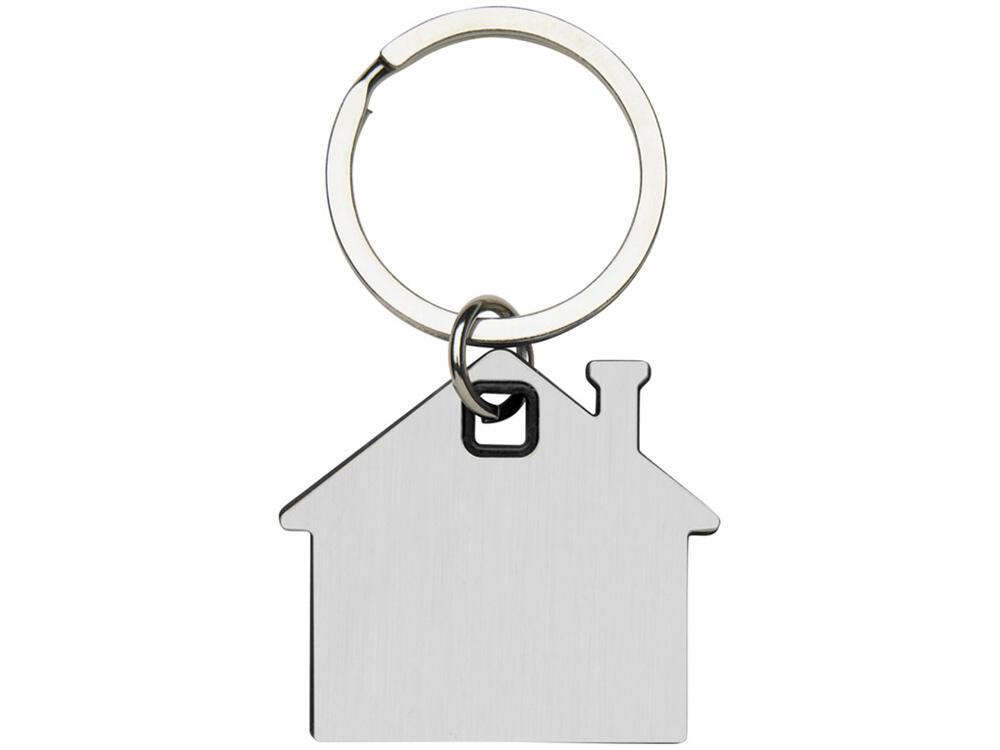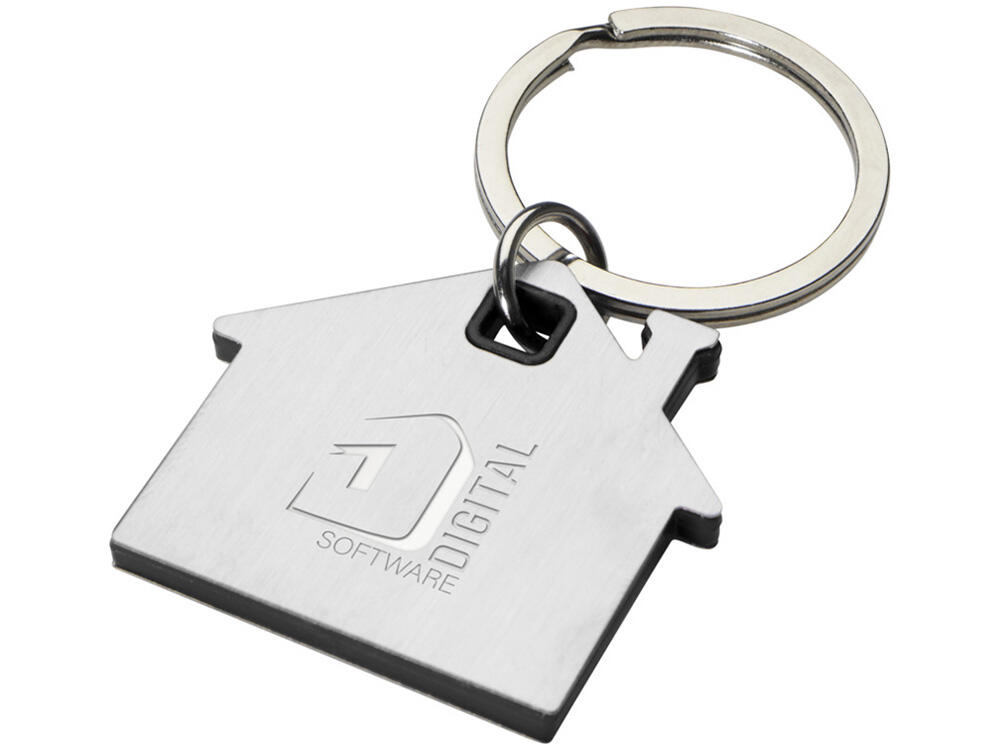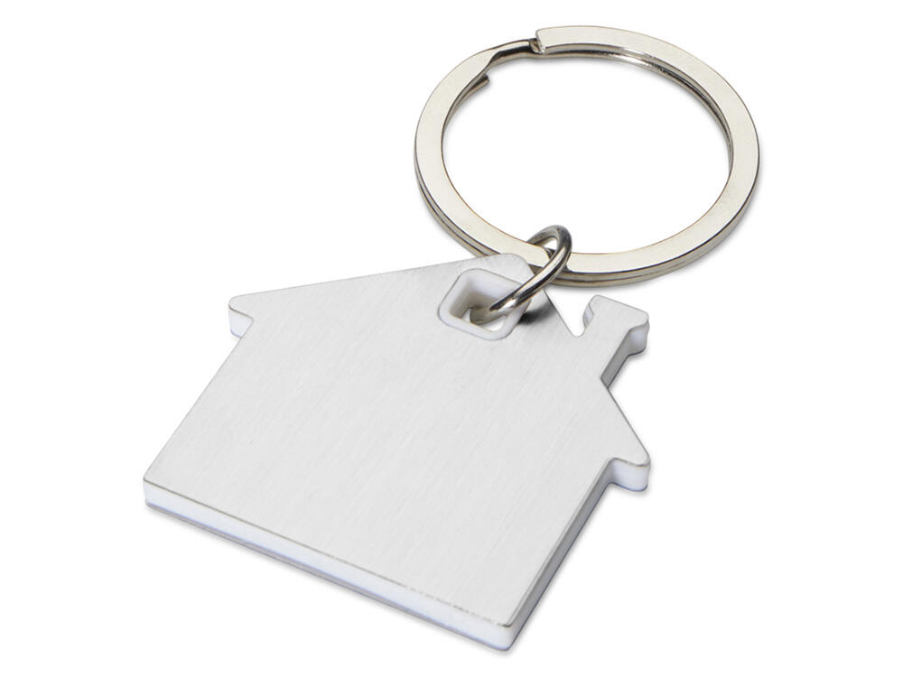 Брелок для ключей в форме домика с цветной вставкой из пластика между 2-мя серебристыми пластинами из стали.