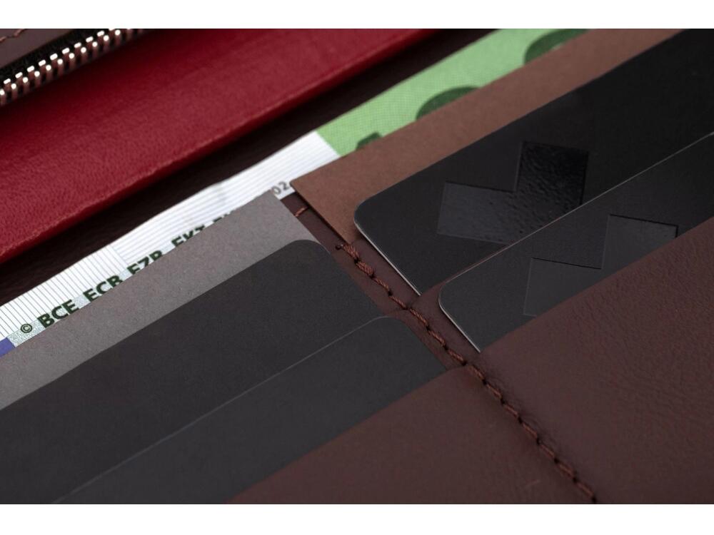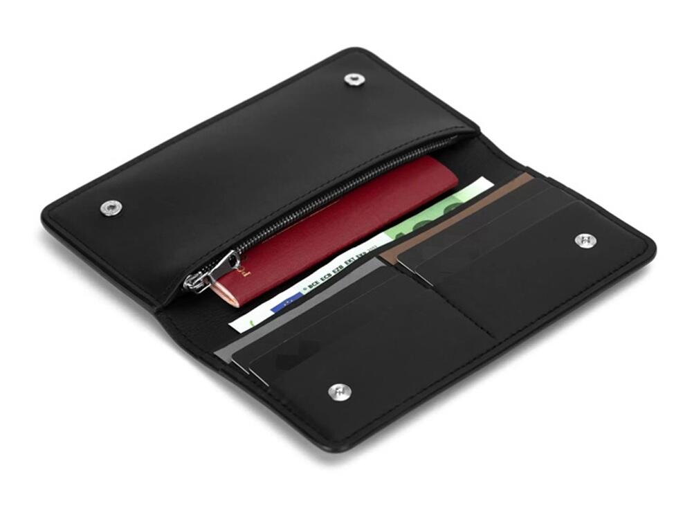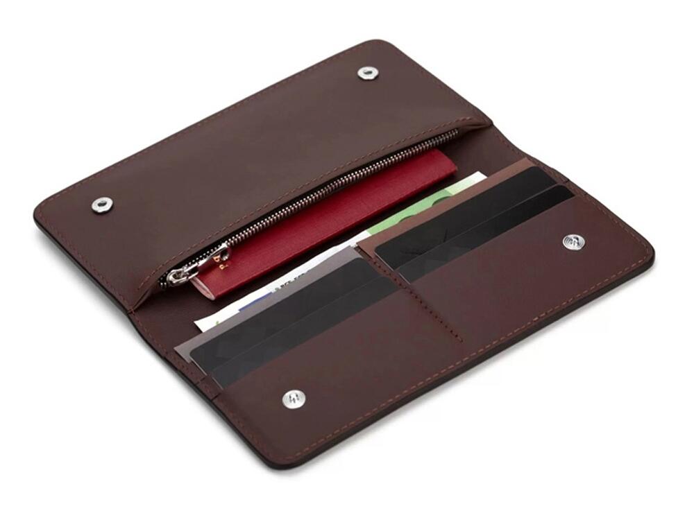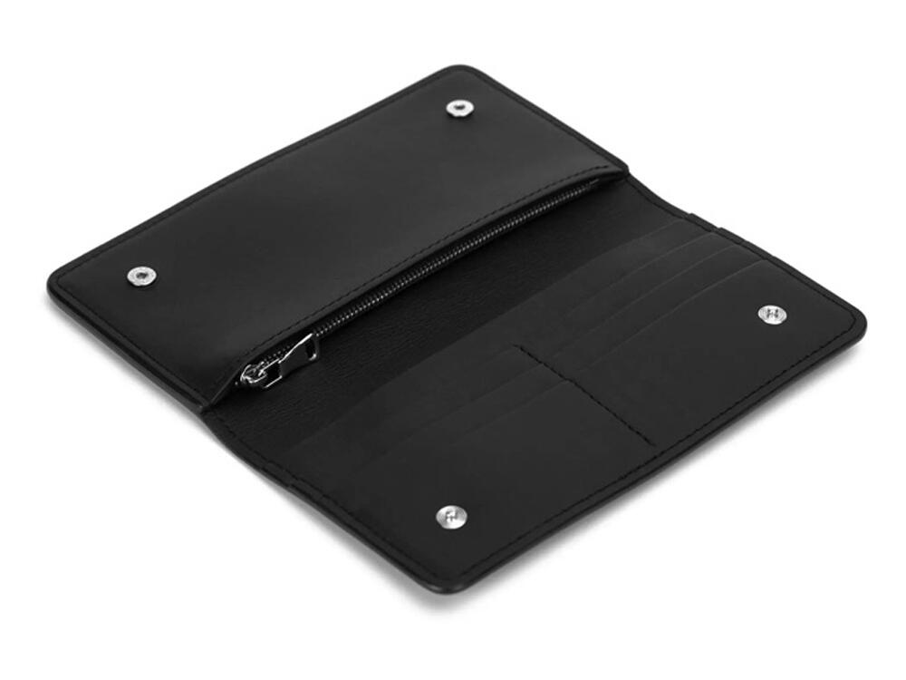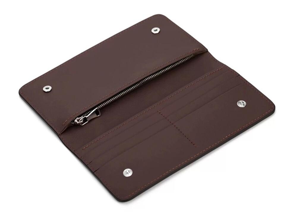 Внутри бумажника есть отделения для карт, купюр и широкое отделение, застегивающееся на молнию. Бумажник закрывается на кнопки, это сделано для того, чтобы он оставался закрытым где бы вы его не носили. Края бумажника окрашены в ручную.