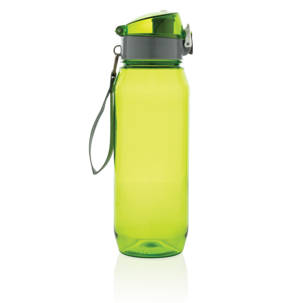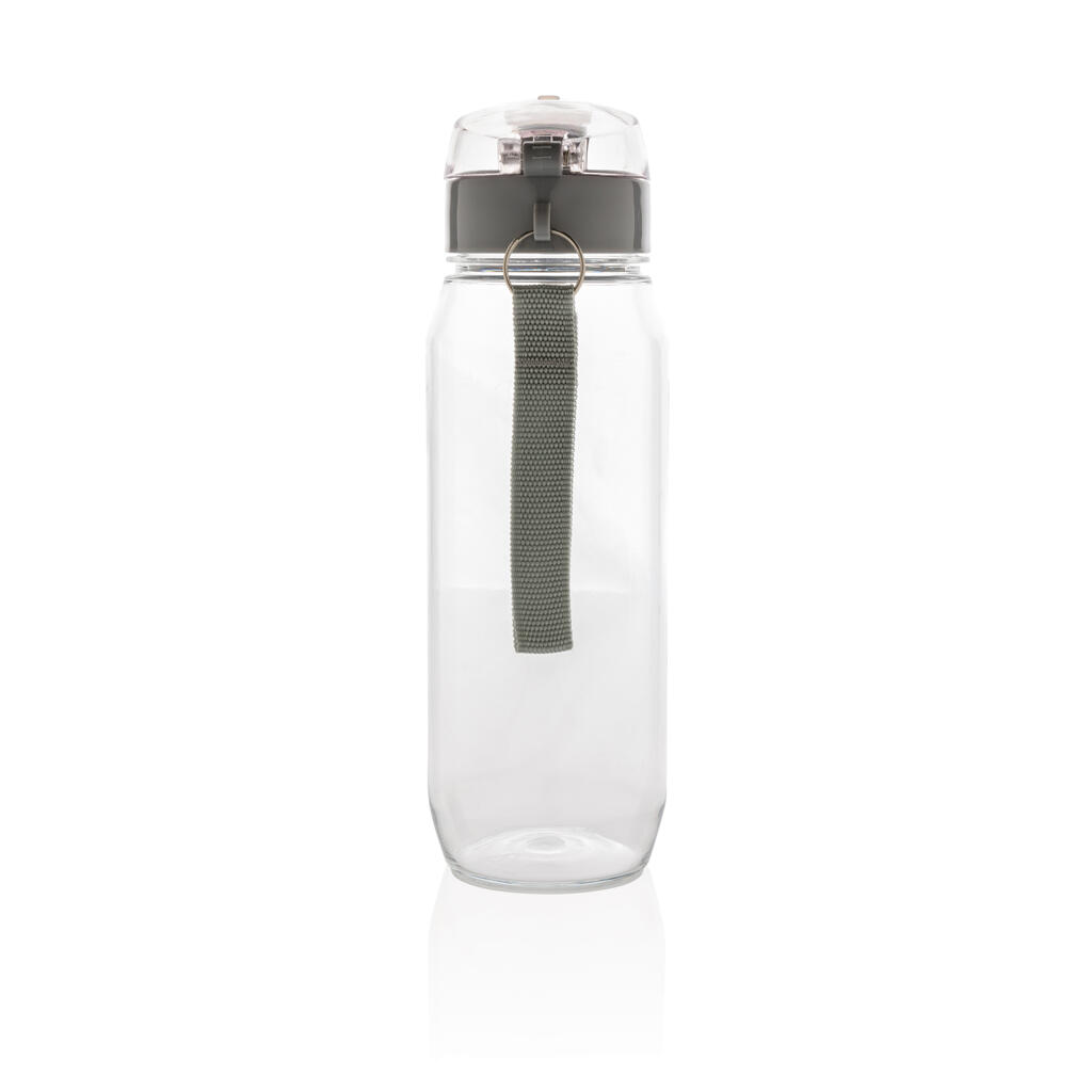 Бутылка для воды Tritan объемом 800 мл. Прозрачная бутылка из экологичного материала, который не впитывает запахи и не содержит бисфенол. У бутылки удобная крышка, которая открывается нажатием на кнопку, есть фиксатор, который не позволит бутылке случайно открыться во время движения. В комплект входит ремешок для запястья.