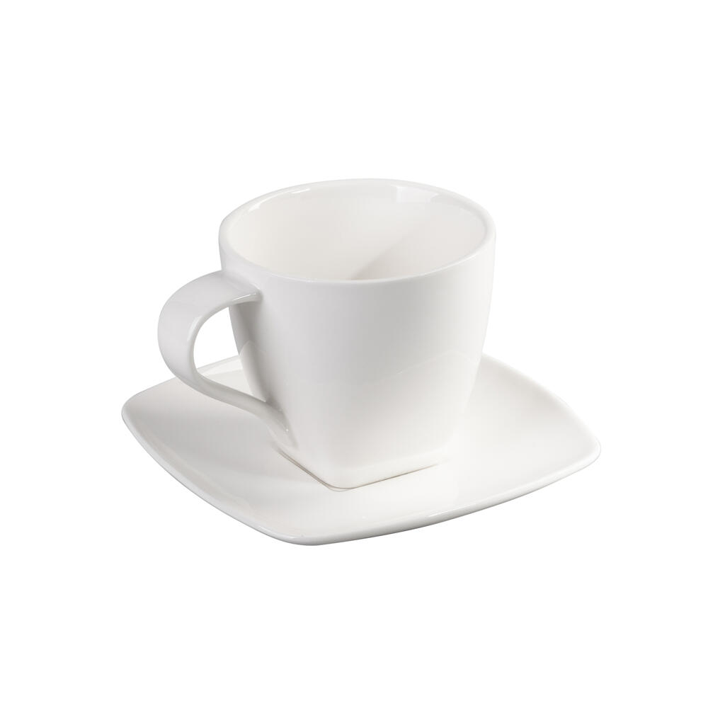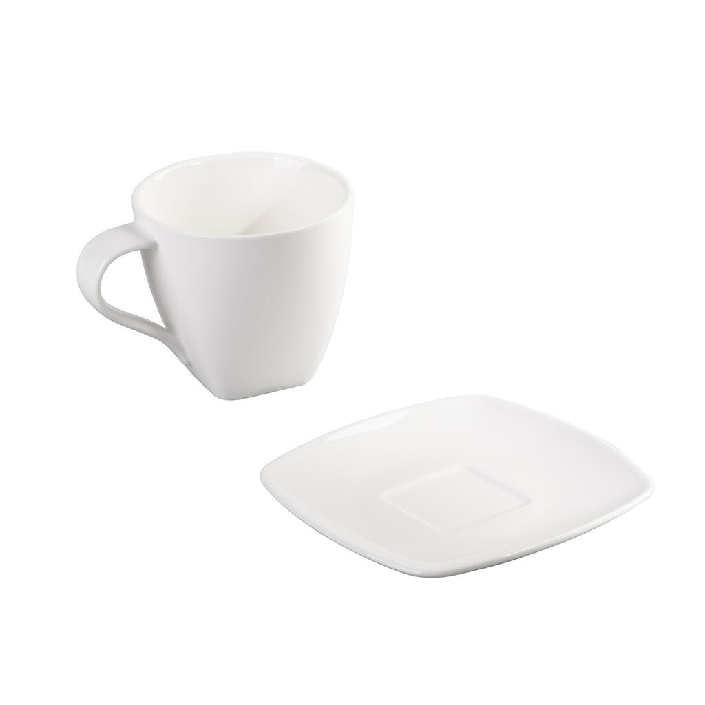 Новая чайная пара в коллекции BISCUIT «Аура» выполнена из белоснежного фарфора высокого качества. Форма чашки – лаконичный конус, плавно переходящий в квадратное основание. Объем чашки 330 мл придётся по душе ценителям больших порций чая или других кофейных напитков.