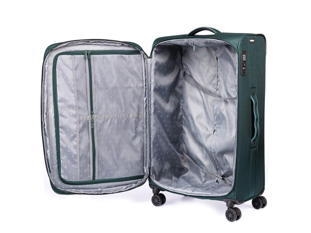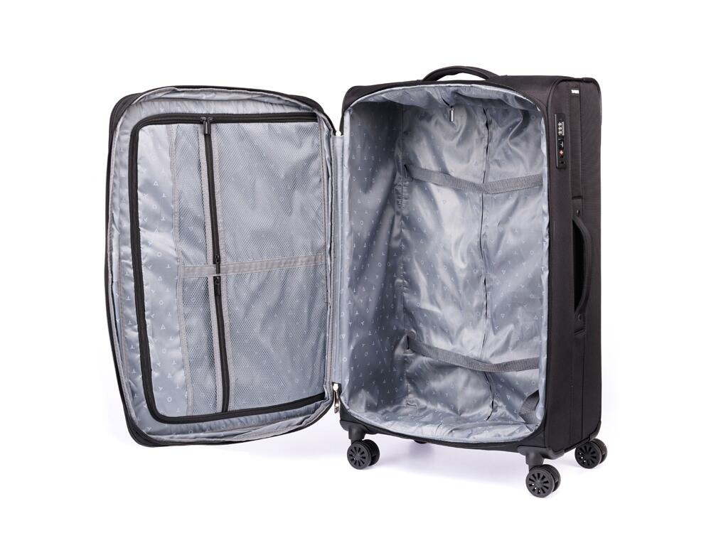 Чемодан полностью раскрывается на 2 отделения, с перегородкой на молнии и ремнями для надежной фиксации вещей на месте.