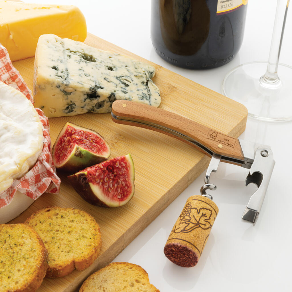 Простой, но функциональный и стильный штопор изготовлен из натуральной древесины бука и нержавеющей стали. У него есть три функции: непосредственно штопор, открывалка для бутылок и резак для фольги. Удобный прочный штопор поможет открыть любую бутылку: используйте открывалку в качестве рычага, и даже самая упрямая пробка будет покорена! Штопор приятно держать в руках благодаря корпусу из дерева, приятного на ощупь.