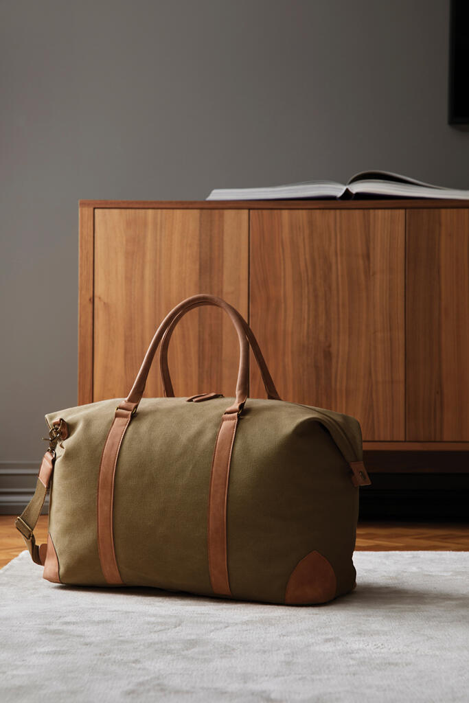 Дорожная сумка из коллекции Bosler изготовлена из канваса: на 40% он состоит из переработанного полиэстера, а на 60% — из переработанного хлопка. Ткань получается плотная и прочная, но при этом легко складывается для удобного хранения. Ручки и декоративные элементы изготовлены из искусственной кожи, фурнитура — из латуни. Если вы любите классику и ретростиль, эта сумка непременно придется вам по душе.