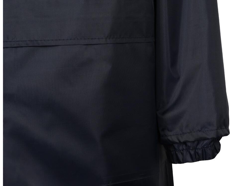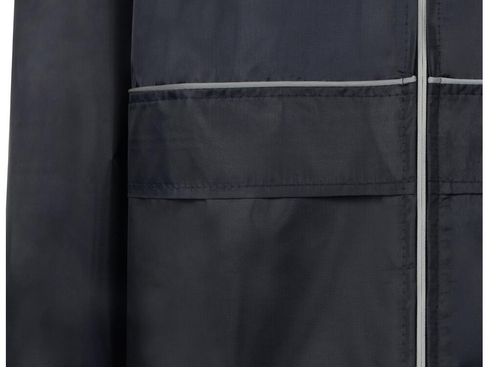 Плащ-дождевик прямого силуэта с капюшоном и рукавом реглан. Застегивается на центральную молнию со светоотражающей полосой с внутренней ветрозащитной планкой. Накладные карманами с клапанами. Двухшовный капюшон с кулиской по краю. Низ рукавов обработан манжетами с внутренней резинкой для комфортной посадке в области запястья. Верхний край клапана кармана, швы капюшона, а также регланные линии обработаны светоотражающим кантом.