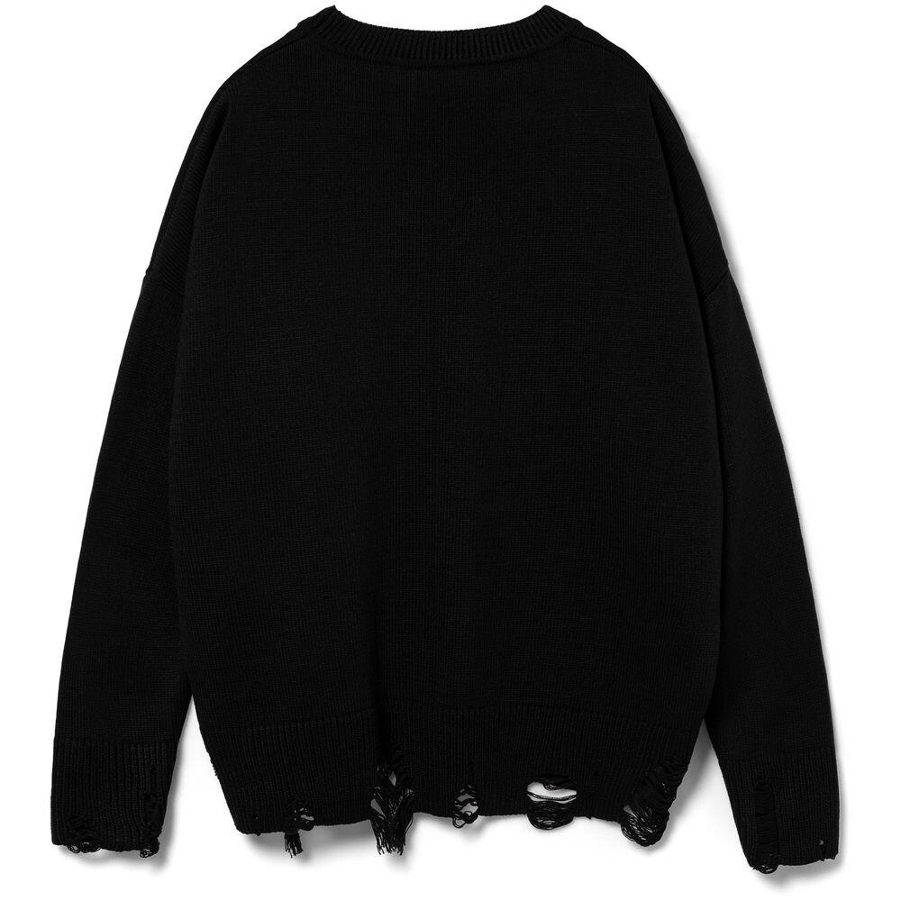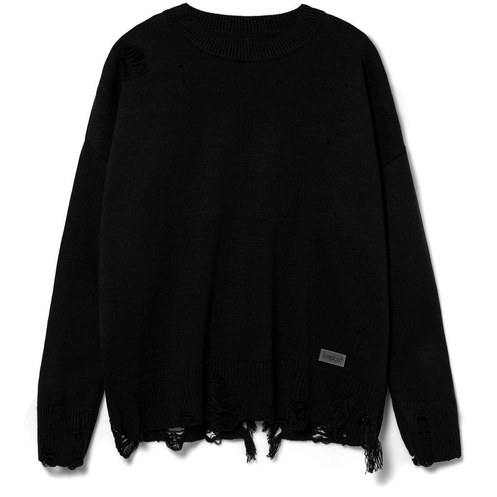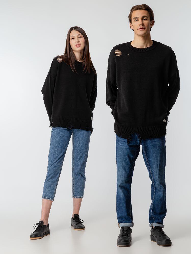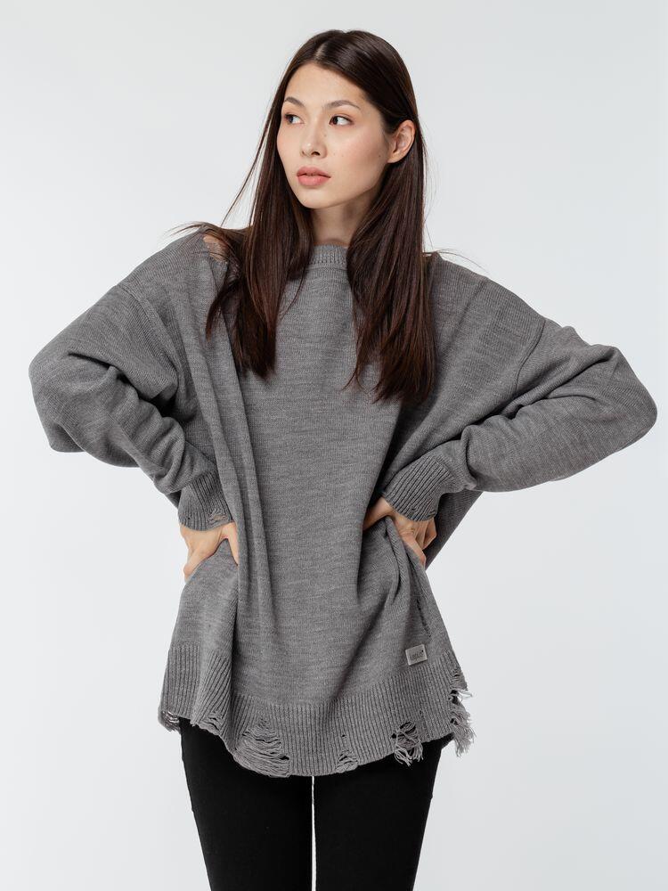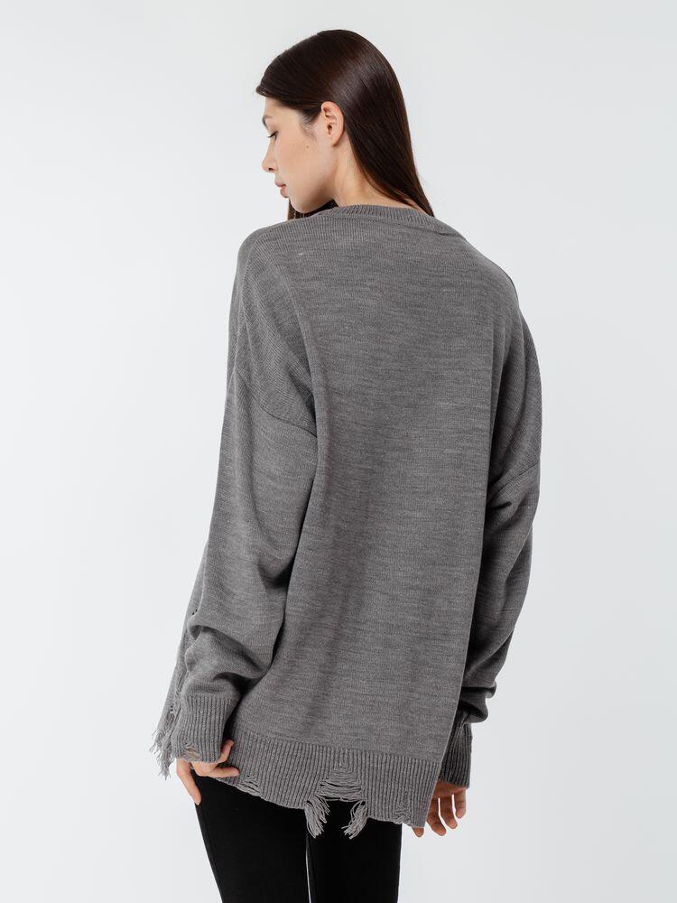Оверсайз джемпер с круглым вырезом и рваными краями. Ворот, манжеты и низ изделия выполнены резинкой.