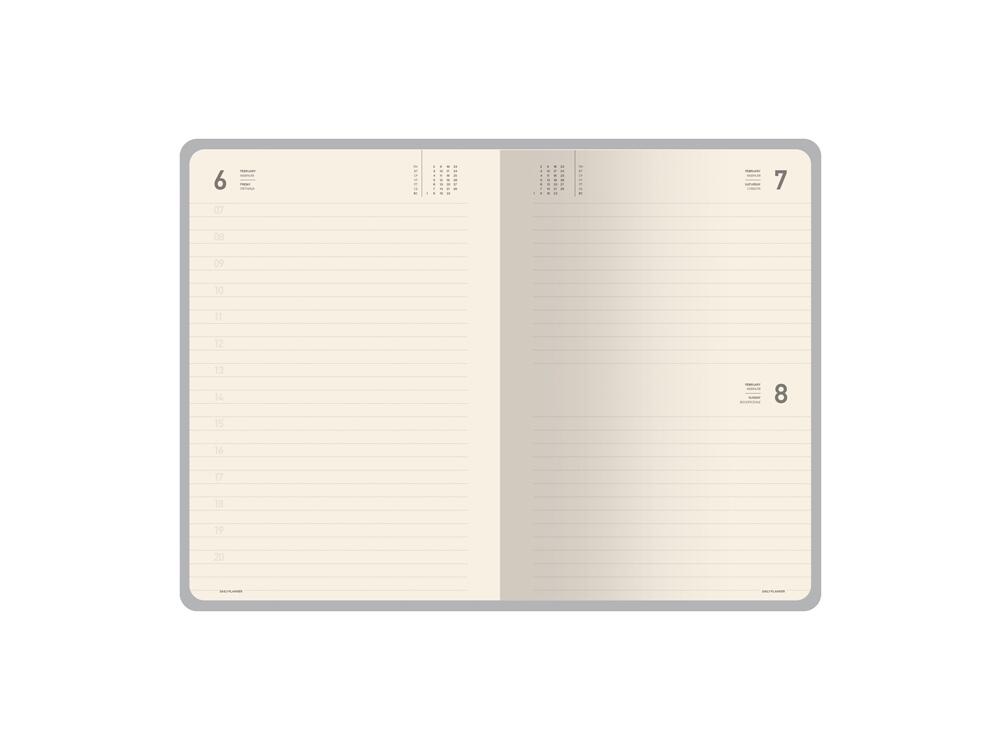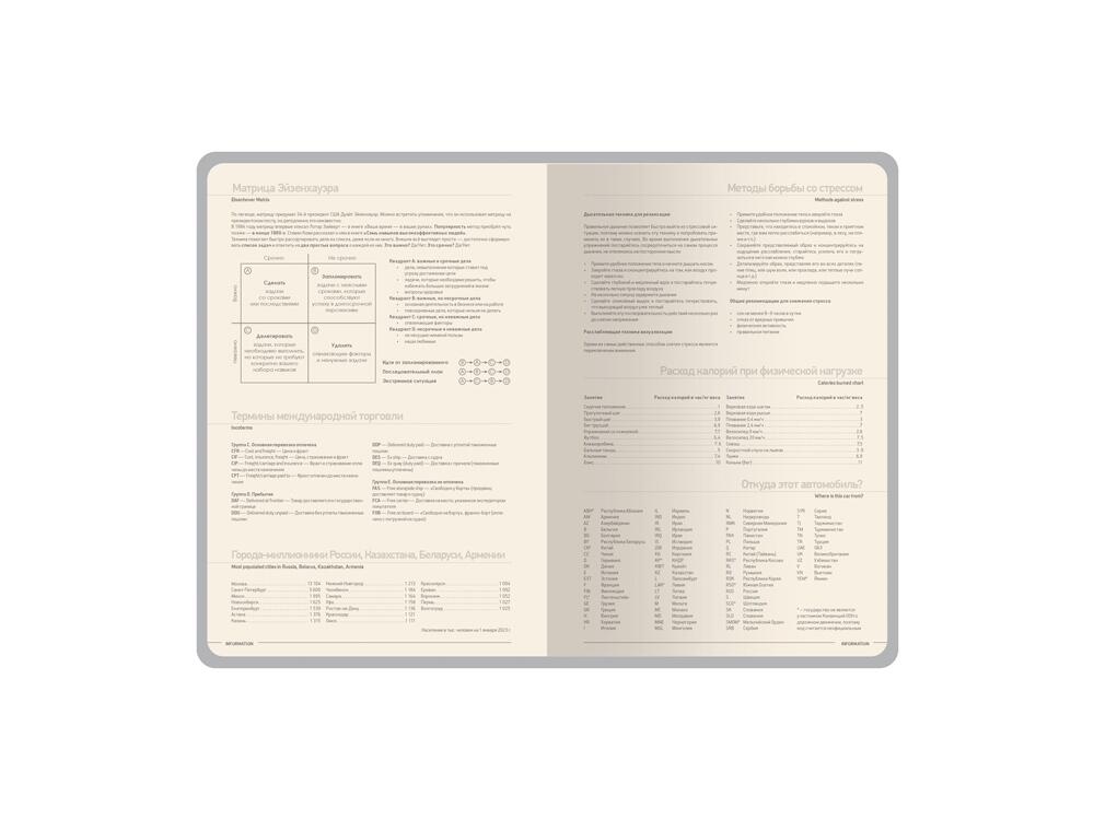 Внутренний блок выполнен из бежевой бумаги плотностью 70 г/кв.м и содержит 14 страниц справочной информации, а также датированные страницы с почасовой разметкой.