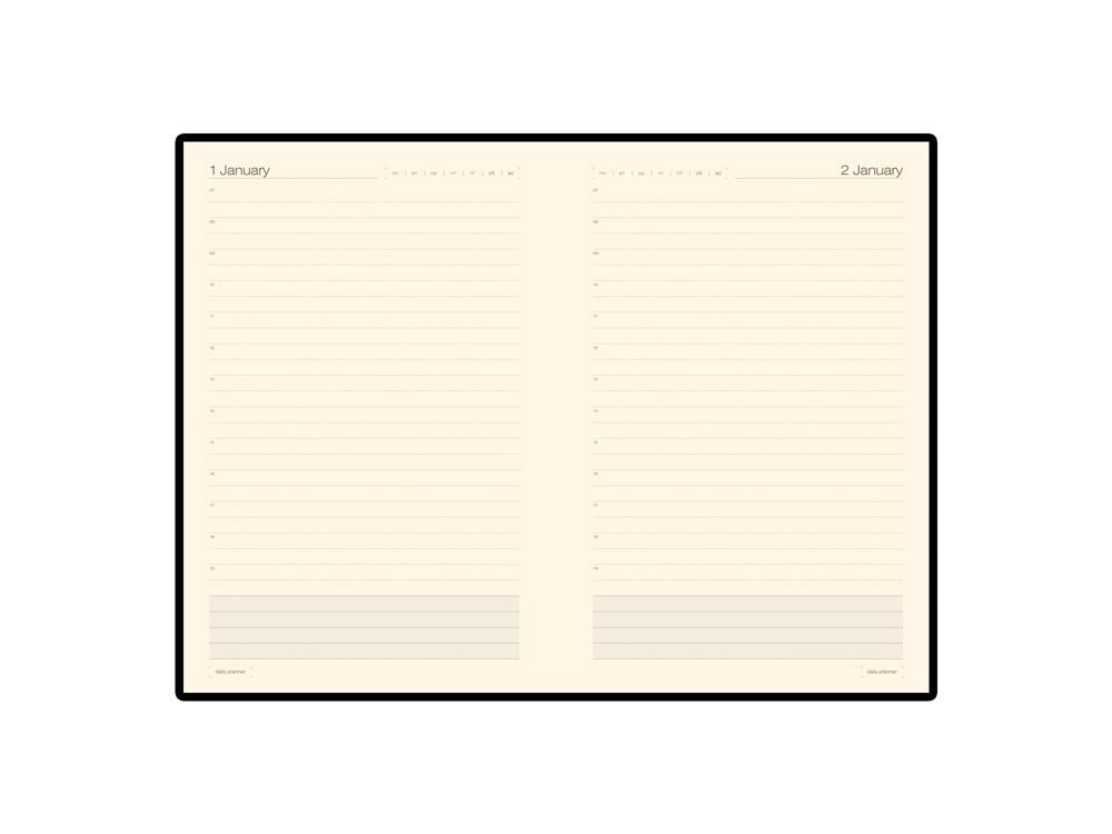 В ежедневнике «Porto» есть полезная справочная информация на русском языке, а также 384 страницы для записи идей, мыслей и составления рабочих планов. Месяц года указан на английском языке, день недели- на русском. Для изготовления страниц используется качественный бежевый офсет повышенной плотности (70 г/кв м). Сменный блок можно вынимать из обложки, вставлять новый.
