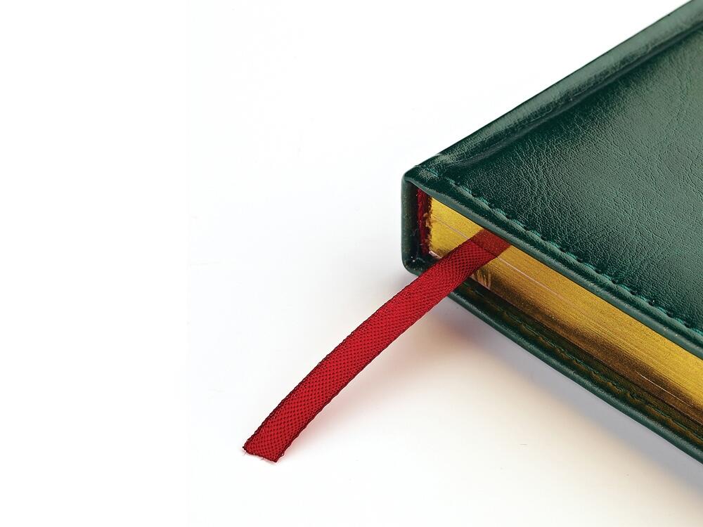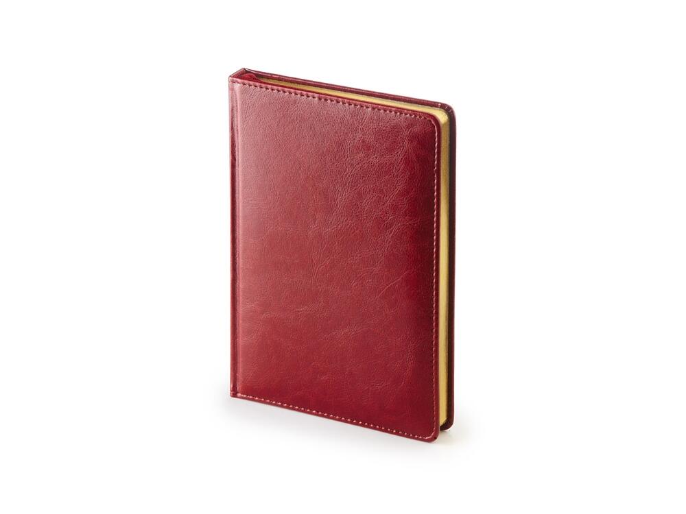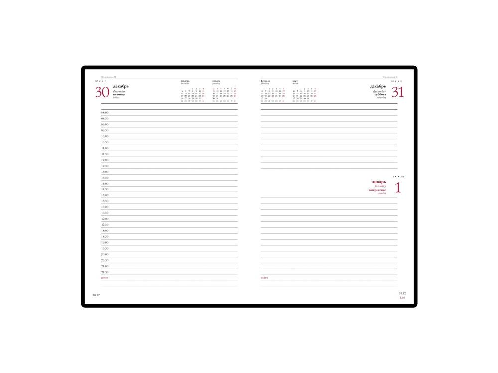 Благородство и статусность придают ежедневнику отстрочка по периметру в тон, скругленные углы, закладка-ляссе бордового цвета, золотой срез.