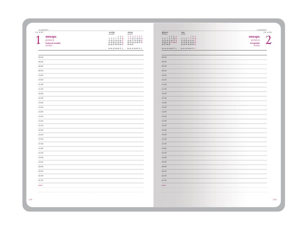 Благородство и статусность придают ежедневнику отстрочка по периметру в тон, скругленные углы, закладка-ляссе бордового цвета, золотой срез.