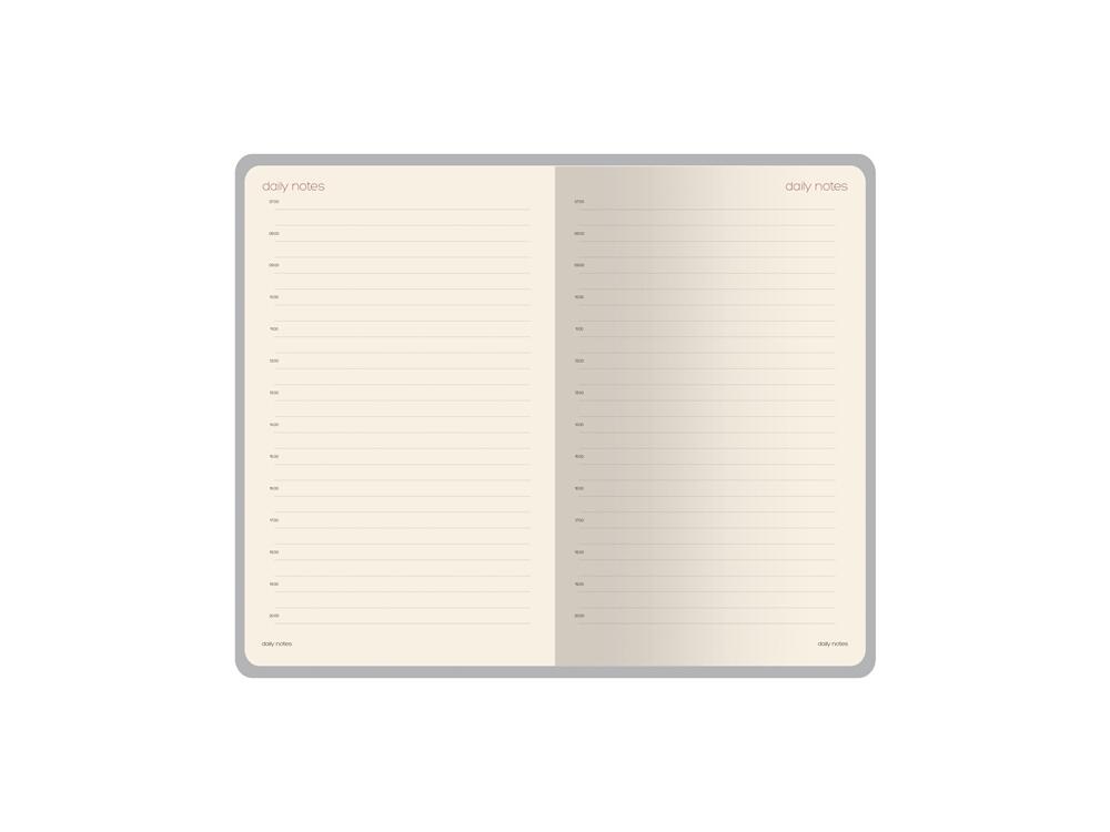 - раздел для планирования имеет линовку серого цвета с указанием времени (интервалы в один час) и выполнен из бежевой бумаги плотностью 70 г/кв.м;