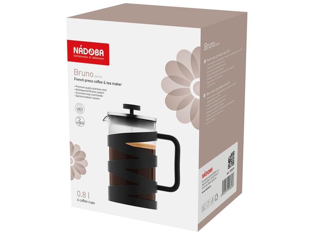 Френч-прессы серии Bruno имеют колбу, выполненную из жаропрочного боросиликатного стекла. Прочный подстаканник из высококачественного пластика обеспечивает дополнительную термоизоляцию и предохраняет колбу от повреждений. Многослойная система фильтрации френч-прессов выполнена из высококачественной нержавеющей стали 18/10. Удобная ручка не нагревается и не выскальзывает из рук. Разборная конструкция изделий и системы фильтрации облегчают легкий и качественный уход. В комплекте предусмотрена мерная ложка 7г для точной дозировки продуктов. В серию входят френч-прессы объёмом 0,8 и 0,6 л. Гарантия на френч-прессы серии Bruno 3 года.