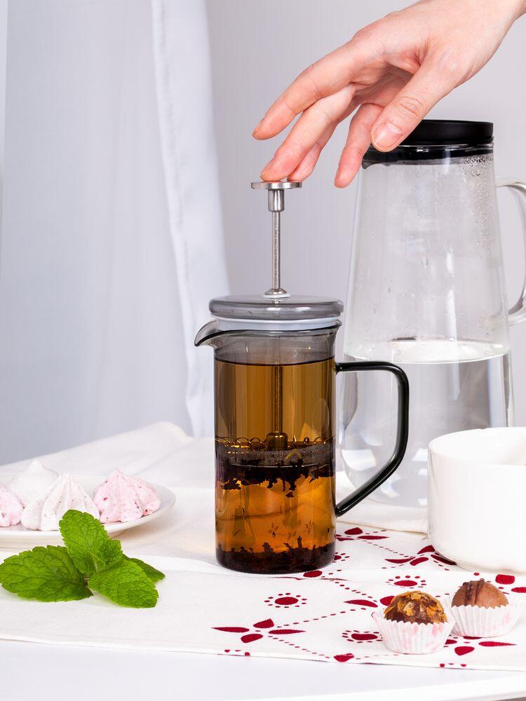 Опустите пресс-фильтр: он плотно прижмет кофе или чайные листья ко дну колбы и не даст им попасть в напиток.