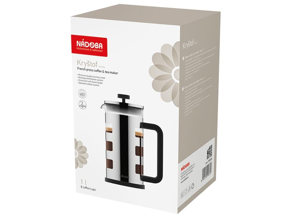 Френч-прессы серии Kryštof имеют колбу, выполненную из жаропрочного боросиликатного стекла. Прочный подстаканник из нержавеющей стали с пластиковой подставкой обеспечивает дополнительную термоизоляцию и предохраняет колбу от повреждений. Многослойная система фильтрации френч-прессов выполнена из высококачественной нержавеющей стали 18/10. Удобная ручка с покрытием "Софт-тач" не нагревается и не выскальзывает из рук. Разборная конструкция изделий и системы фильтрации облегчают легкий и качественный уход. В комплекте предусмотрена мерная ложка 7г для точной дозировки продуктов. В серию входят френч-прессы объёмом 1 и 0,6 л. Гарантия на френч-прессы серии Kryštof 3 года.