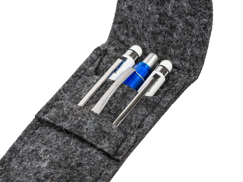 Футляр изготовлен из RPET-фетра. Этот материал хорошо держит форму и легко чистится, а ещё его использование позволяет заботиться об окружающей среде, поскольку он производится из переработанного пластика.
