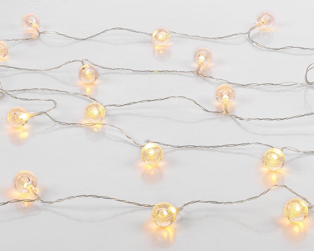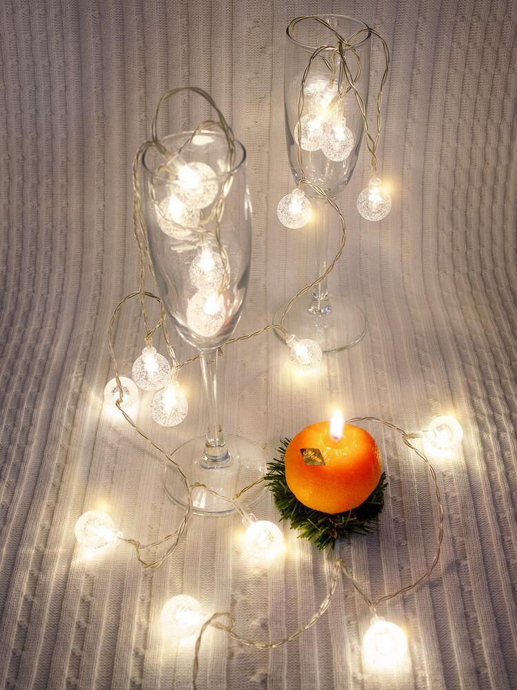 Гирлянда состоит из 20 светодиодов с теплым светом. Работает на 3 батарейках типа АА (в комплект не входят). Предназначена для использования в помещении.