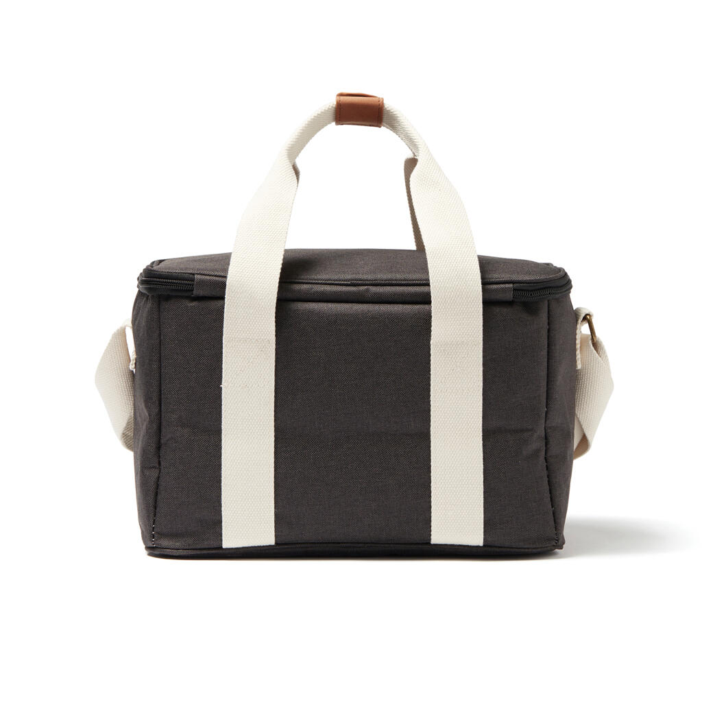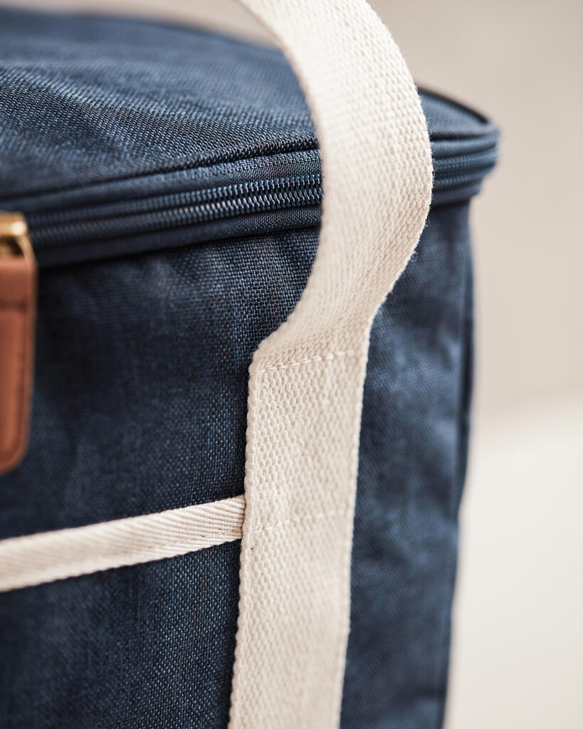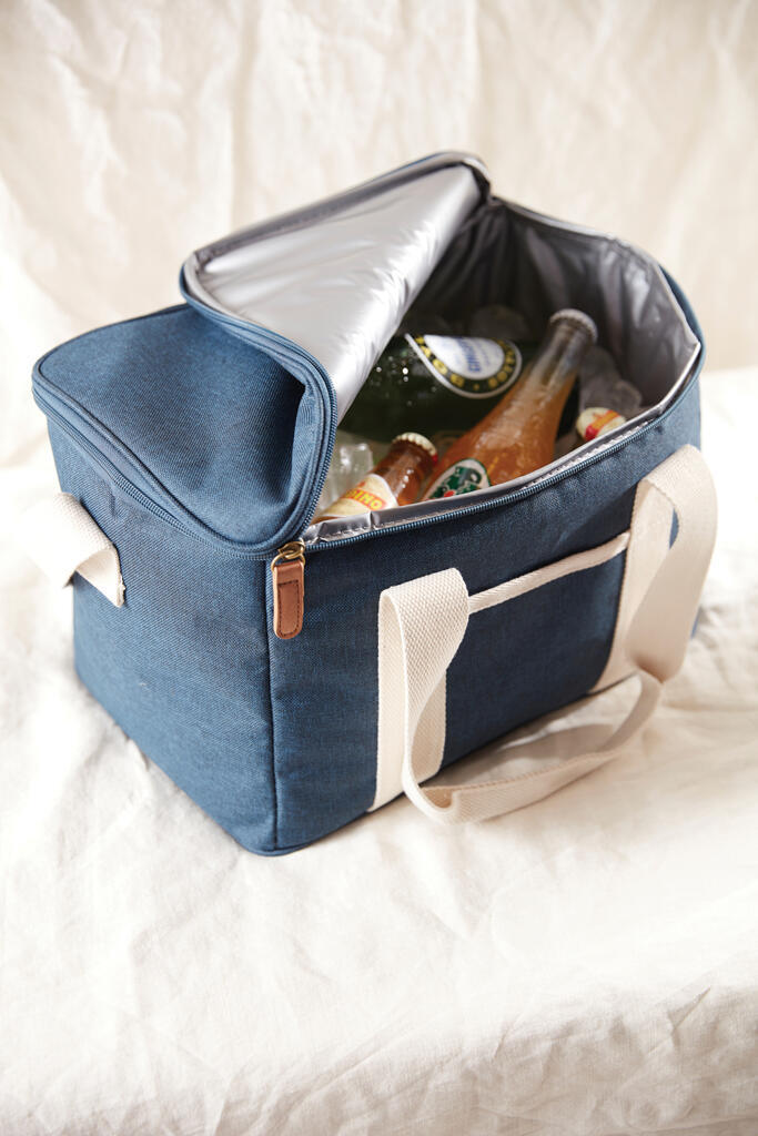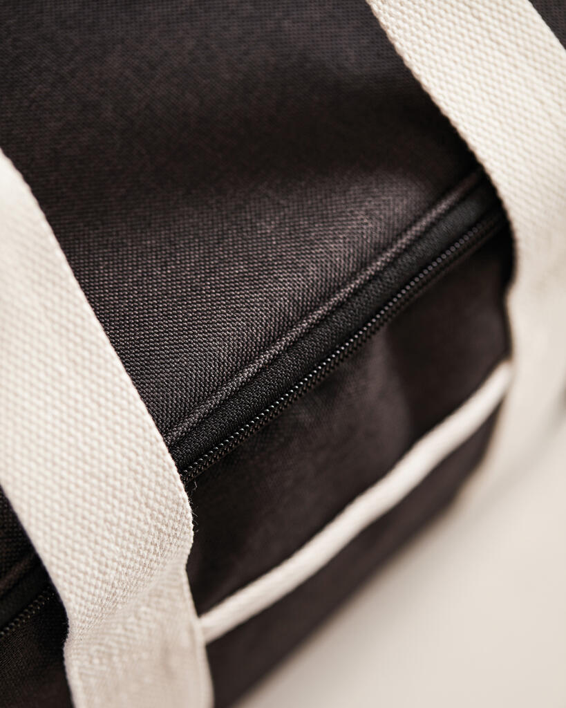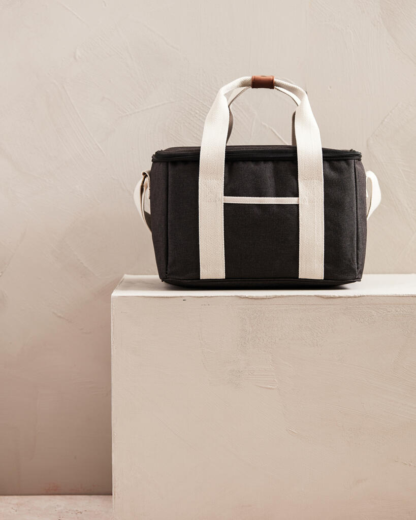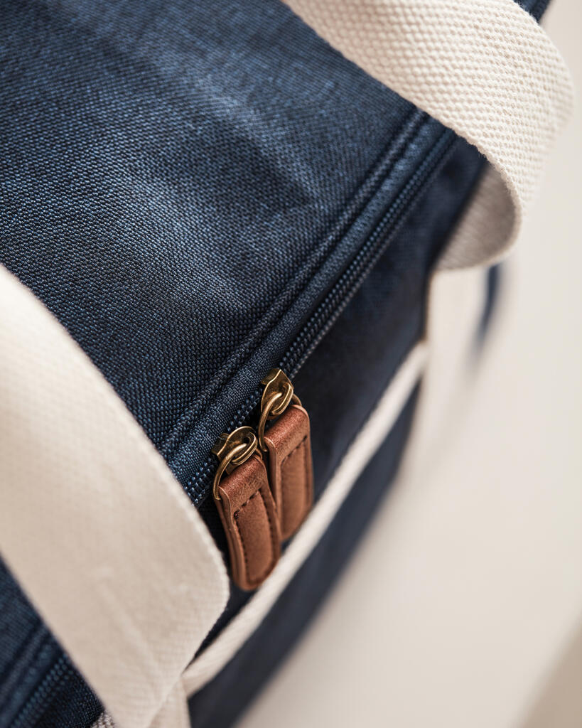 Это универсальная сумка-холодильник с контрастными деталями на 50% изготовлена из rPET, переработанных пластиковых бутылок. Снаружи есть небольшое отделение для важных мелочей. Благодаря плотному подкладу из PEVA сумка легко моется и долго сохраняет холод. Есть регулируемый плечевой ремень и короткие ручки.