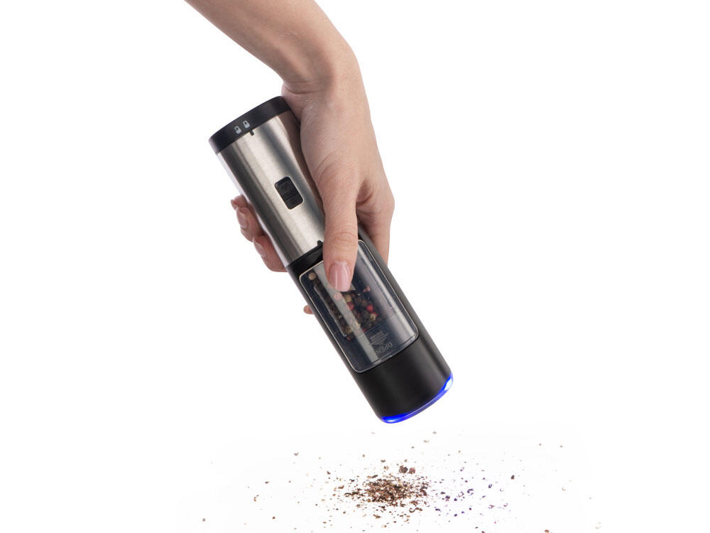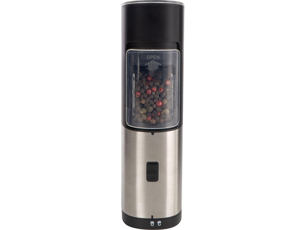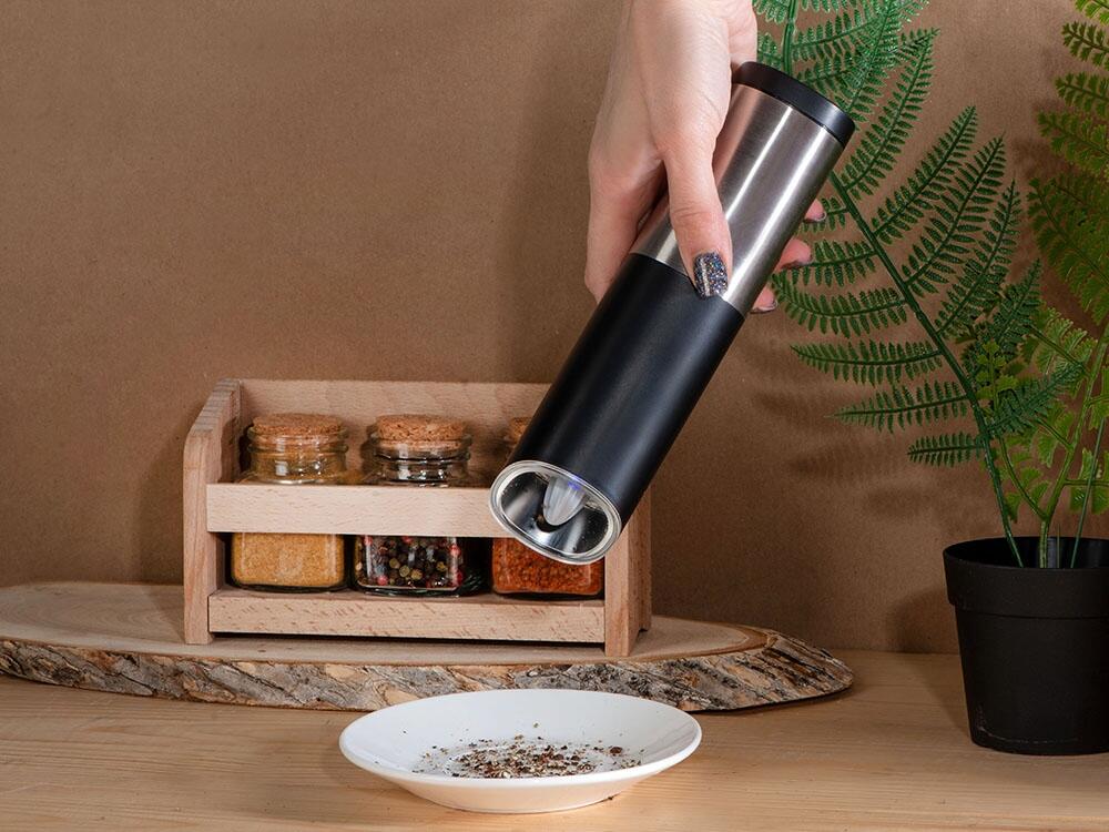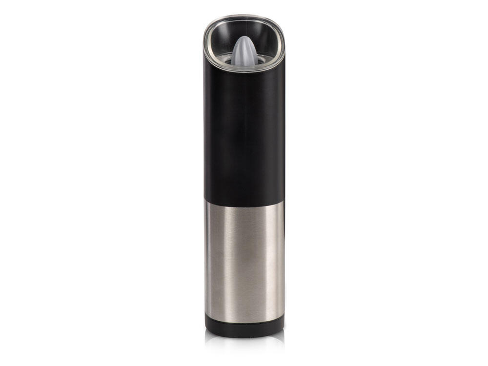 Мельница включается лишь в перевернутом положении, что позволяет снизить расход батареек и решает проблему случайного срабатывания устройства. Эргономичный корпус выполнен из нержавеющей стали и текстурного АБС-пластика.