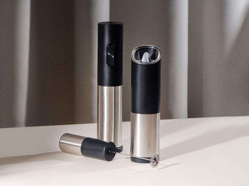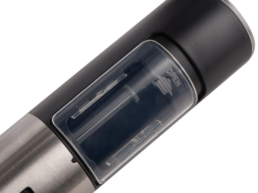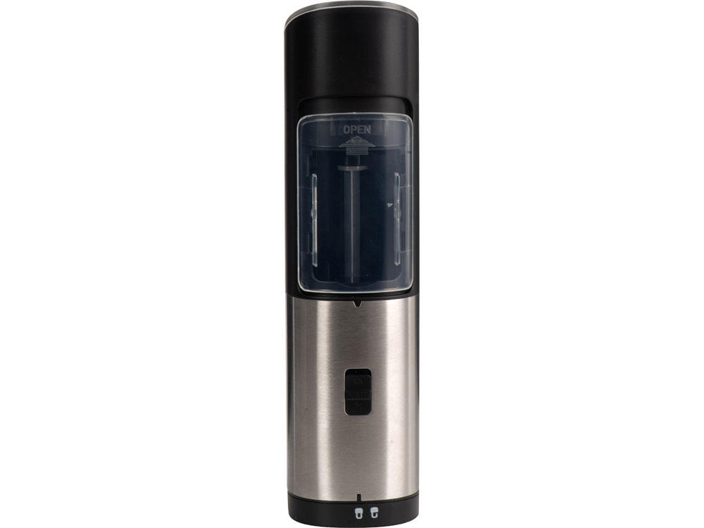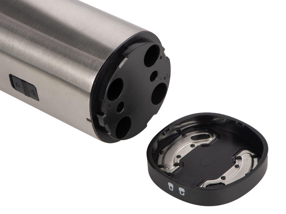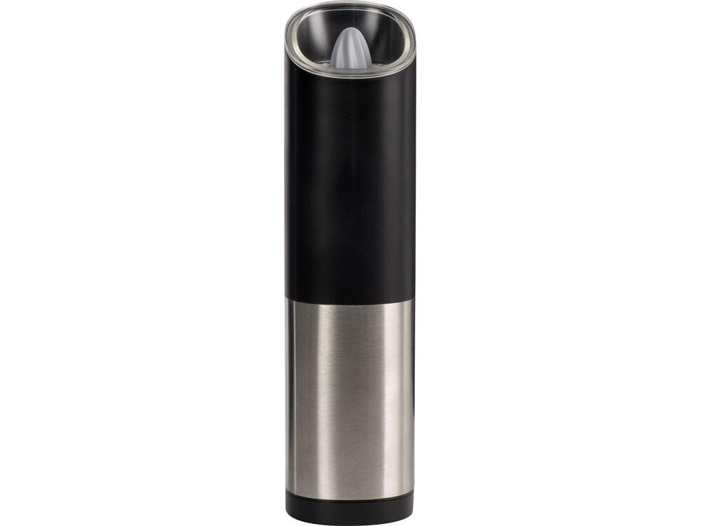 Мельница включается лишь в перевернутом положении, что позволяет снизить расход батареек и решает проблему случайного срабатывания устройства. Эргономичный корпус выполнен из нержавеющей стали и текстурного АБС-пластика.