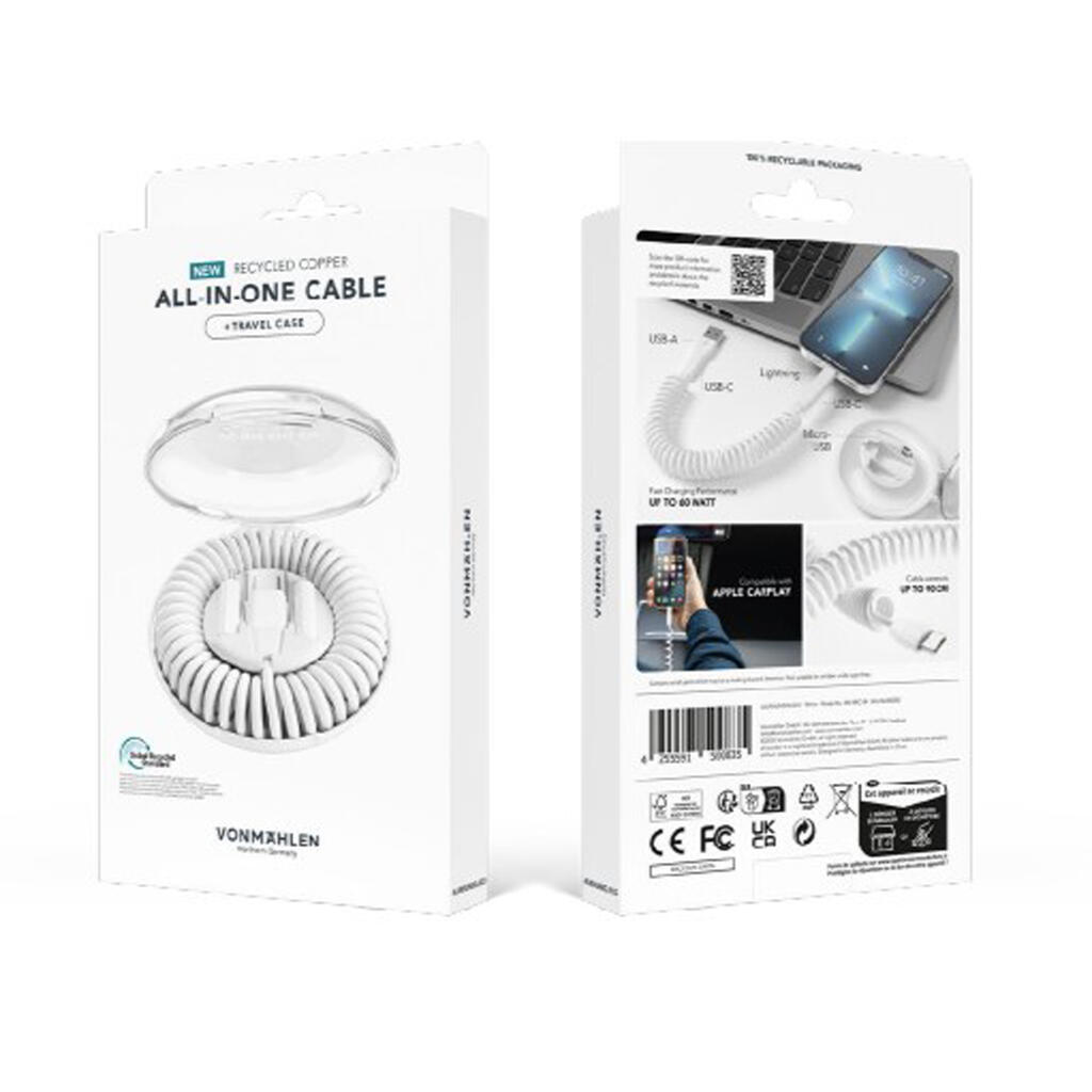 Универсальный кабель VONMAHLEN allroundo® eco 6 в 1 отличается компактными размерами и возможностью быстрой зарядки гаджетов (до 60 Вт). С его помощью можно не только зарядить, но и передать данные на устройство. Растягивается до 90 см, что обеспечивает большую свободу движений. Экологичное решение для ваших гаджетов: на 75% кабель состоит из переработанных материалов. Оснащен входом/выходом USB-C. В комплект входят адаптеры USB-A, Micro-USB и Lightning, поэтому кабель подходит для всех современных устройств.