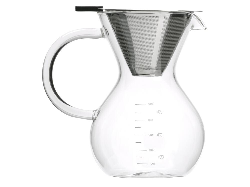 Большой объём позволяет заварить до 500 мл кофе за раз — это две стандартных порции. Жаропрочное боросиликатное стекло отлично переносит перепады температуры, а удобная ручка не нагревается, поэтому можно сразу разливать горячий напиток.