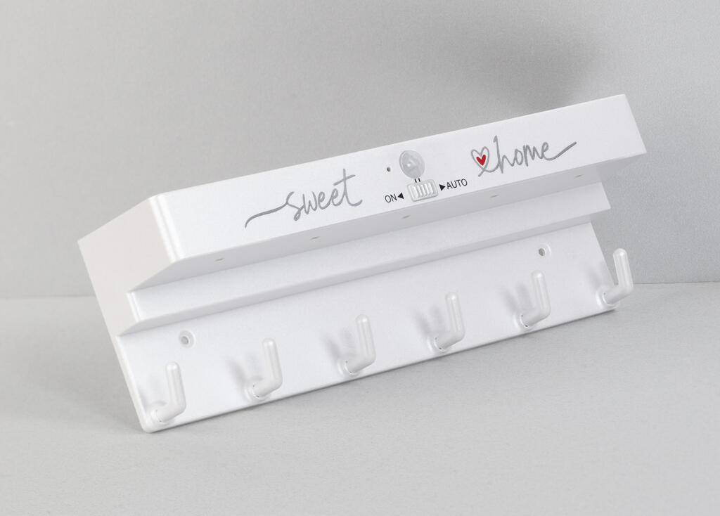 Шесть надежных крючков позволят аккуратно развесить ключи, сверху расположена удобная полочка. Универсальный белый цвет ключницы для любого интерьера, красивый перламутровый металлик. Рекомендуем обратить внимание на гравировку твердотельным лазером (L2), см. доп. фото.