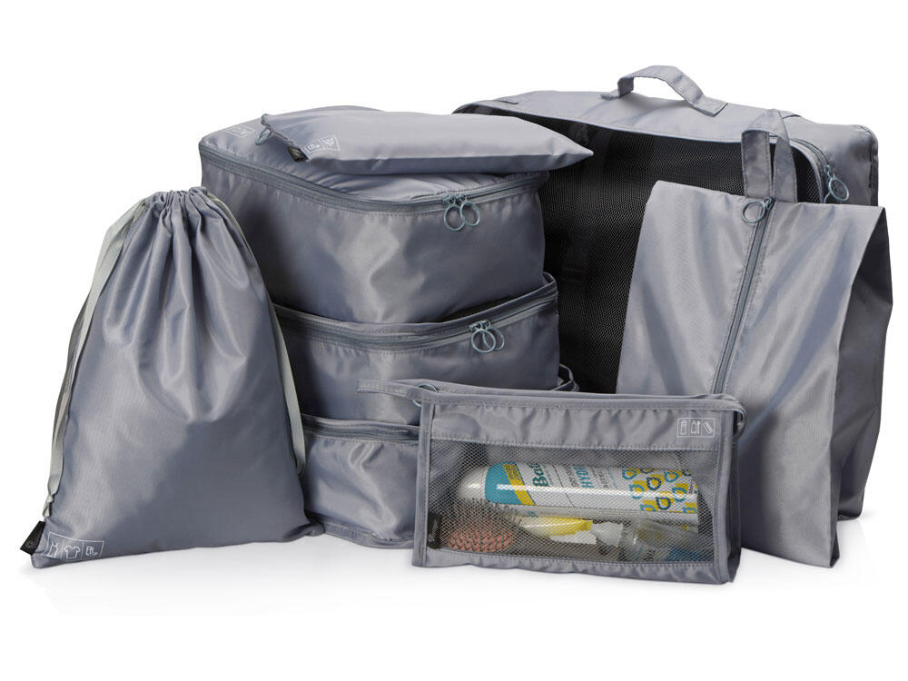Чехлы — самых разных форм и размеров, предназначенные для разнообразного содержимого: одежды, обуви, косметики и гигиенических принадлежностей. Чехлы выполнены в виде мешков на кулиске, сумок на молнии, косметичек, некоторые из них оснащены сеткой для циркуляции воздуха и доступного просмотра содержимого, а также ручками для переноски и подвешивания. Иконки на чехлах подскажут, для чего предназначен каждый из них.