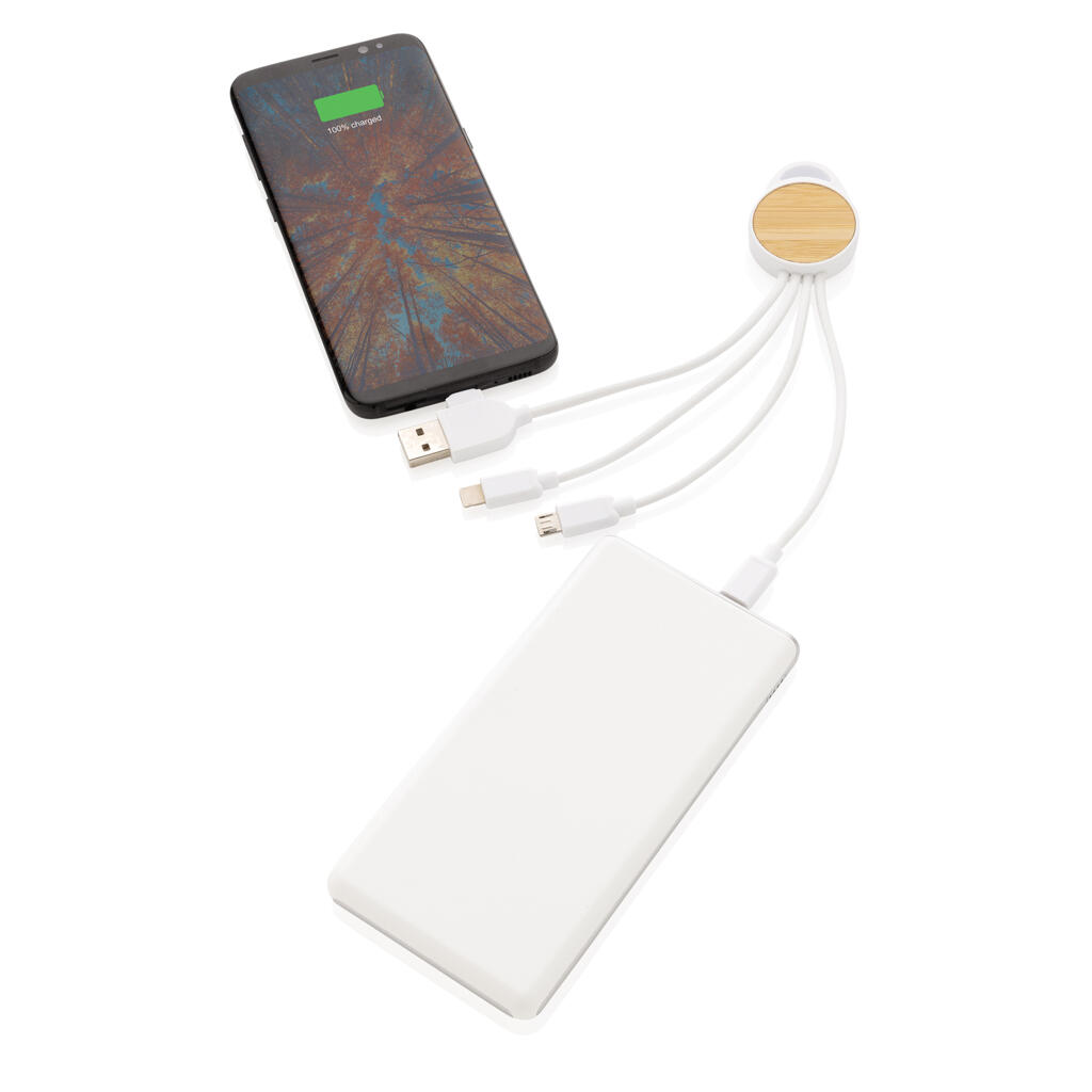 Компактный кабель с 5 разъемами: вход USB C, вход USB A, выход Type C, выход для устройств IOS и выход micro USB. Это позволяет использовать кабель для устройств с выходами Type C, которыми оснащены многие современные смартфоны и ноутбуки Macbook. Кроме того, в кабеле есть разъем USB A, что делает его универсальным. Кабель сделан из бамбука, ABS-пластика и TPE (без ПВХ). Длина кабеля 20 см.