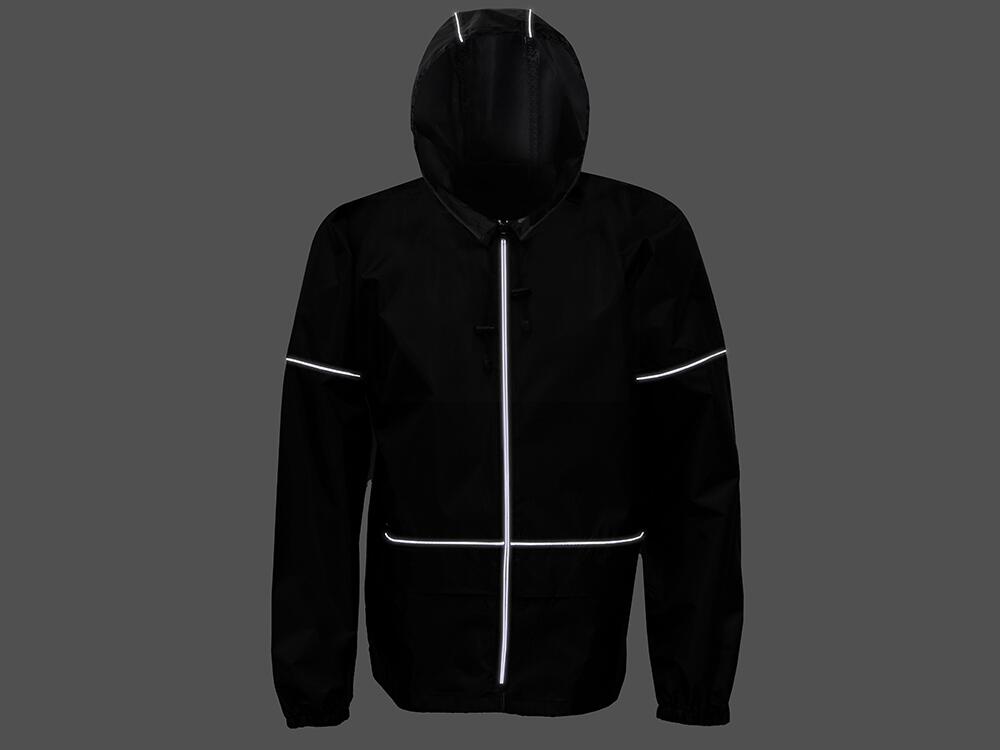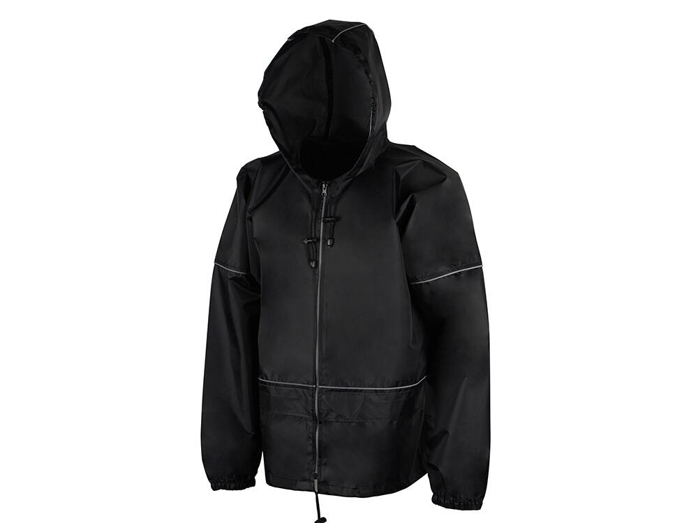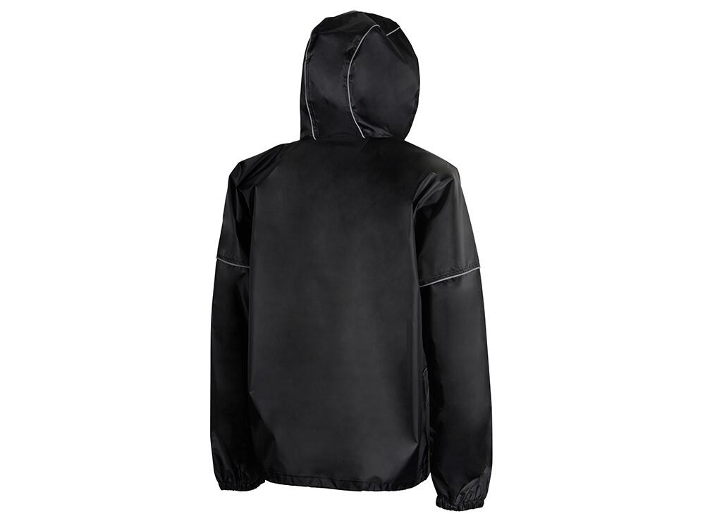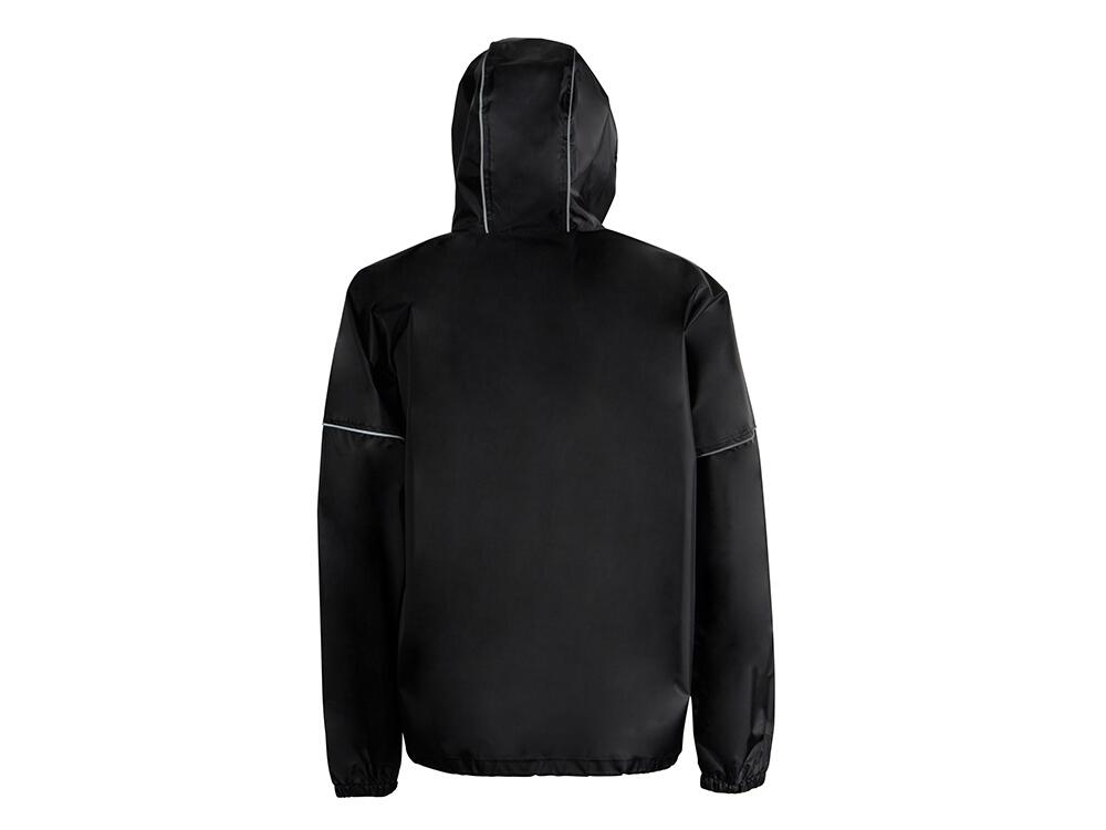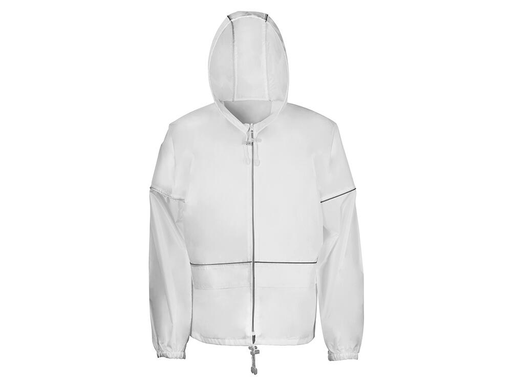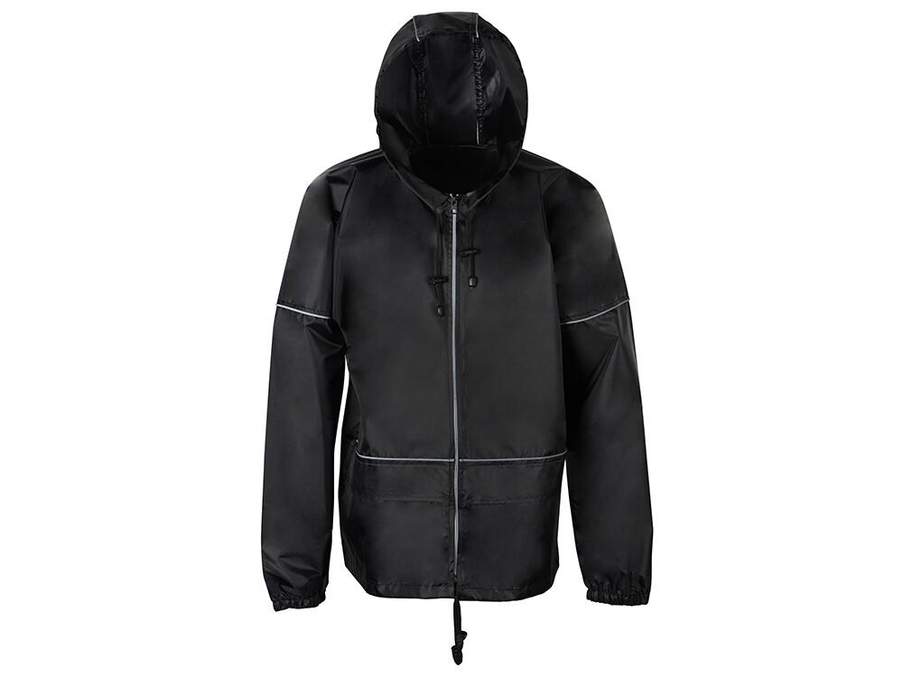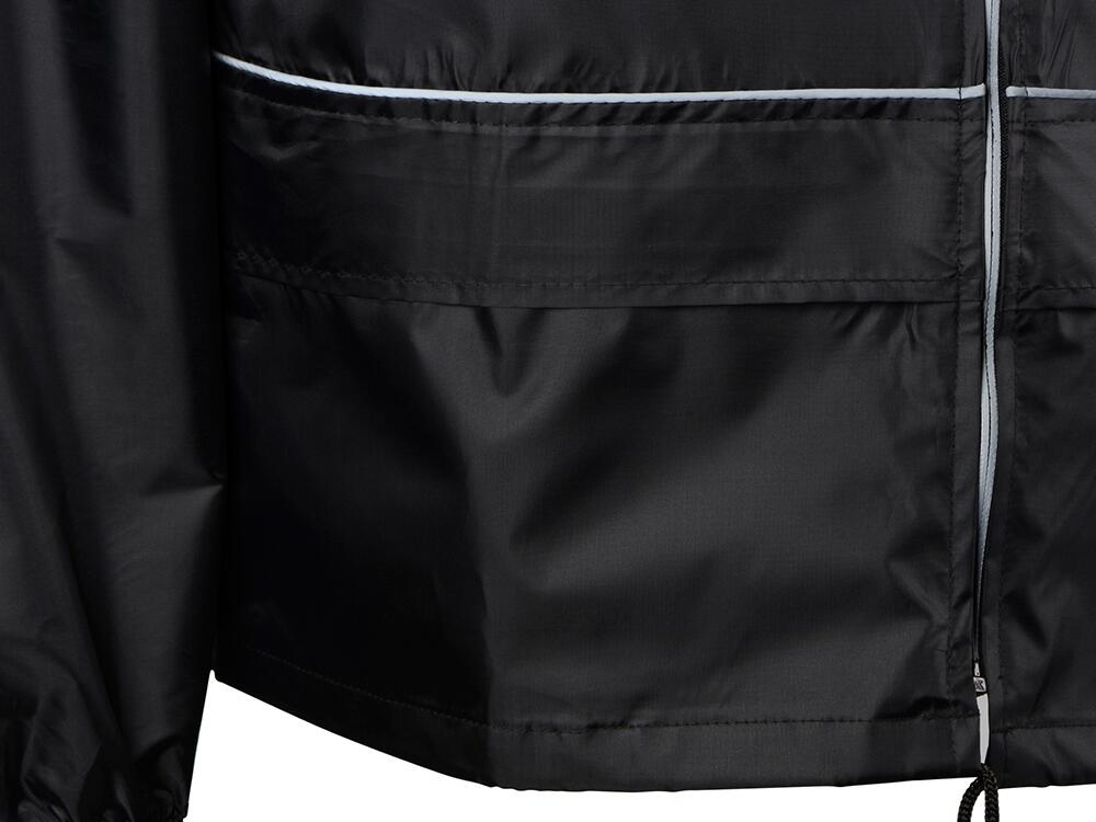 Короткий дождевик прямого силуэта с капюшоном и карманами. Вместительные накладные карманы защищены сверху клапанами, по верхней кромке которых вшит светоотражающий кант. Светоотражающие элементы также расположены на рукавах, капюшоне и молнии, что делает человека заметным даже в темное время суток.