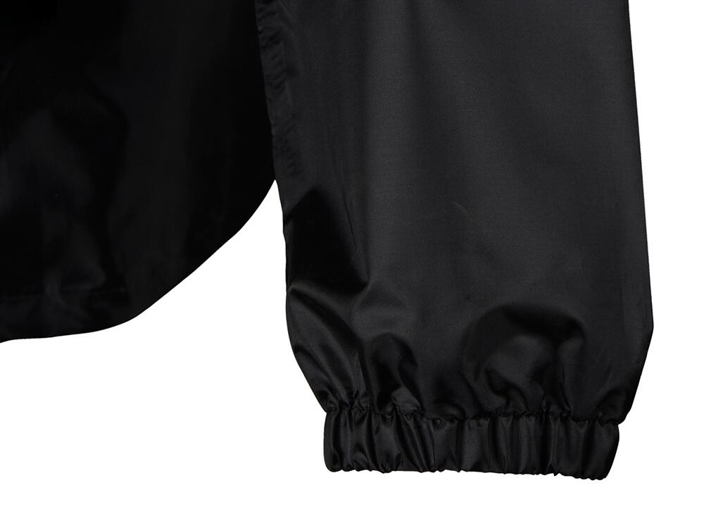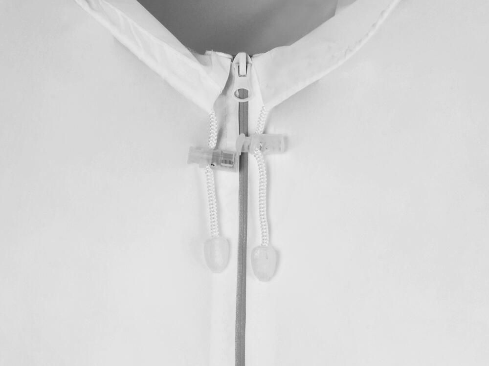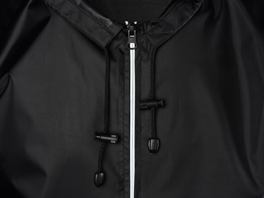 Капюшон и низ дождевика затягиваются на шнурки с фиксаторами, что позволяет отрегулировать посадку по фигуре. Манжеты дождевика — на резинке.