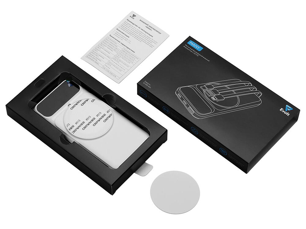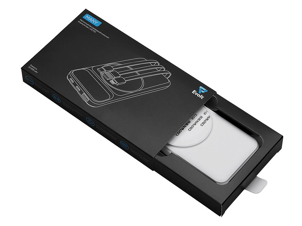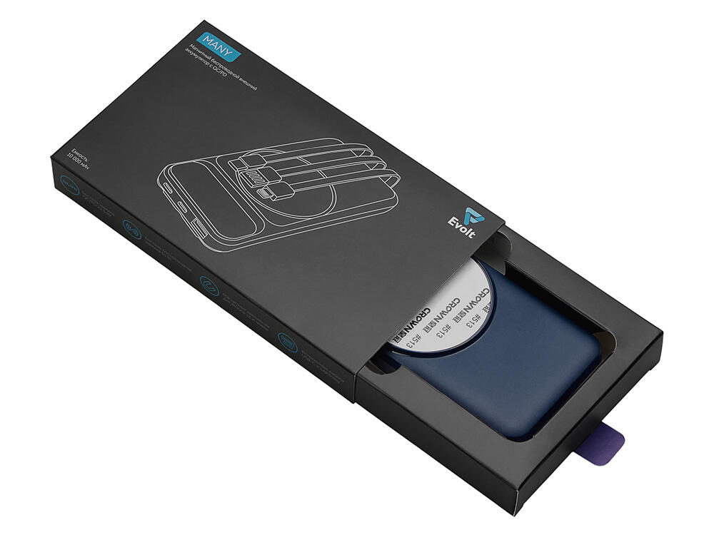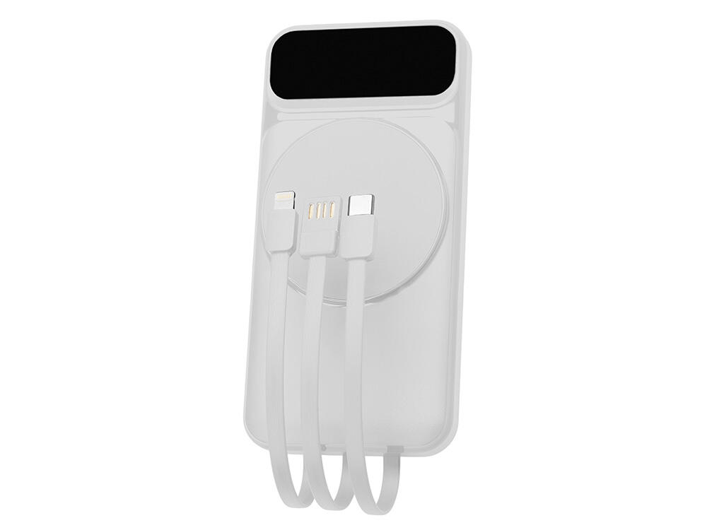 Функциональный и удобный внешний аккумулятор на 10 000 мАч обеспечивает быструю зарядку как по кабелям, так и беспроводным способом, поддерживая современные стандарты скорости. Цифровой дисплей на верхней панели мгновенно показывает точный уровень заряда, а встроенные кабели Lightning, USB-C и входной USB-A устраняют необходимость в дополнительных проводах — всё, что нужно для каждодневного использования, уже есть в самом гаджете. Компактные габариты, сопоставимые с размером смартфона, делают устройство идеальным для путешествий и повседневного использования. Сильные магниты гарантируют надёжное крепление при беспроводной зарядке. В комплекте есть силиконовая накладка: перед использованием удалите защитный стикер и прикрепите её к корпусу.