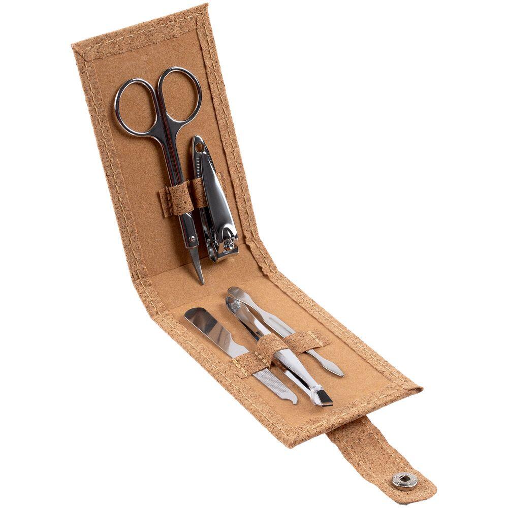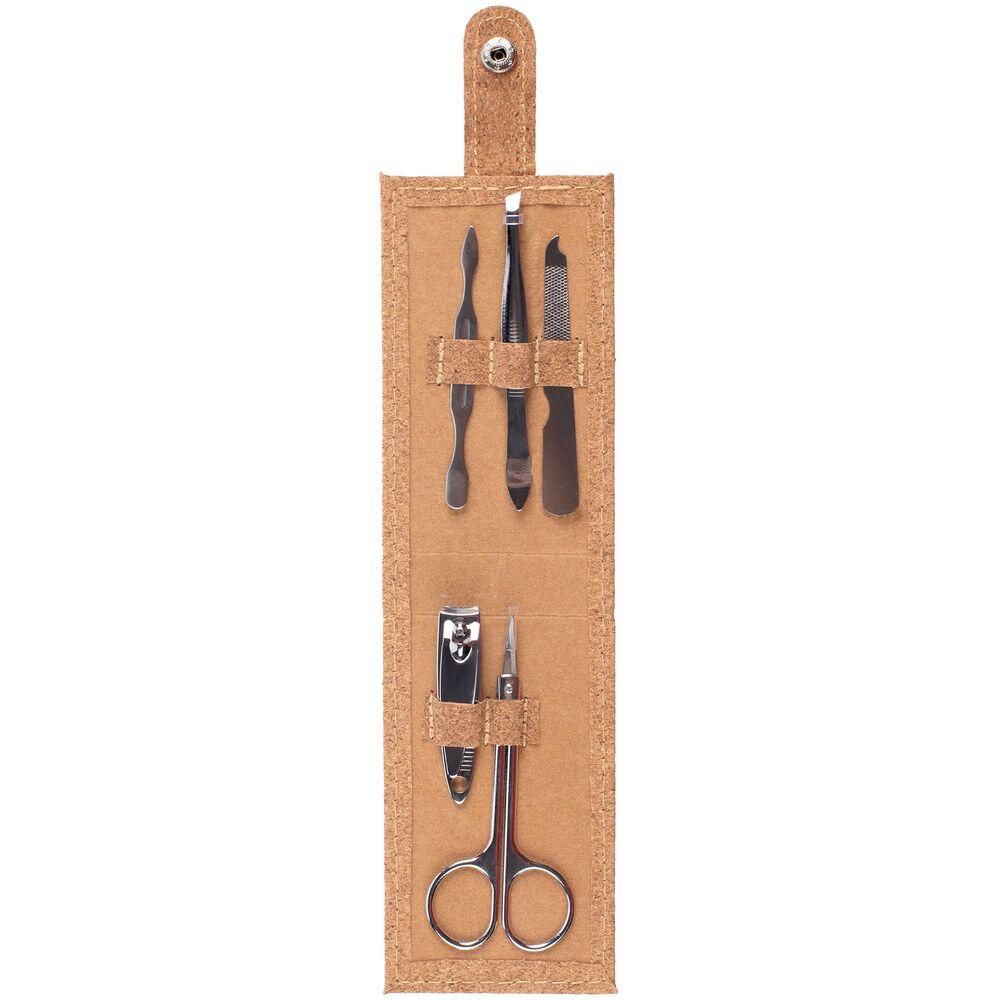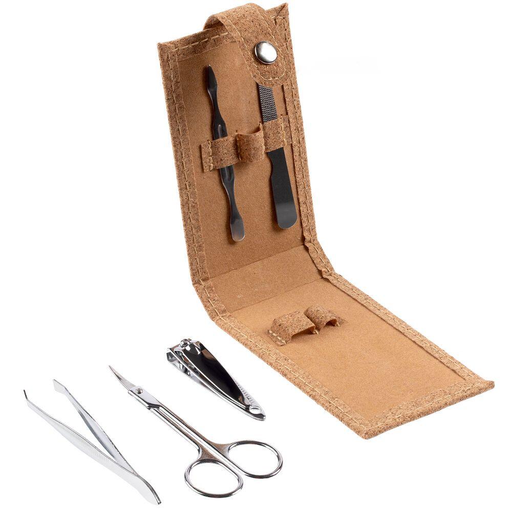 Набор для маникюра в футляре из пробки с 5 инструментами из нержавеющей стали: пилкой, ножницами, кусачками для ногтей, пинцетом и лопаткой для кутикулы. Поставляется в бумажной упаковке.