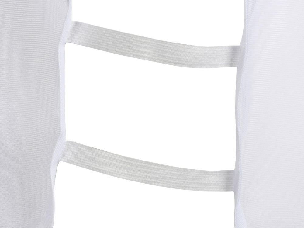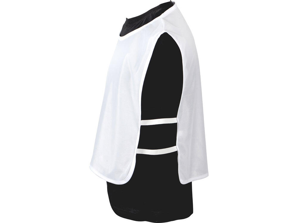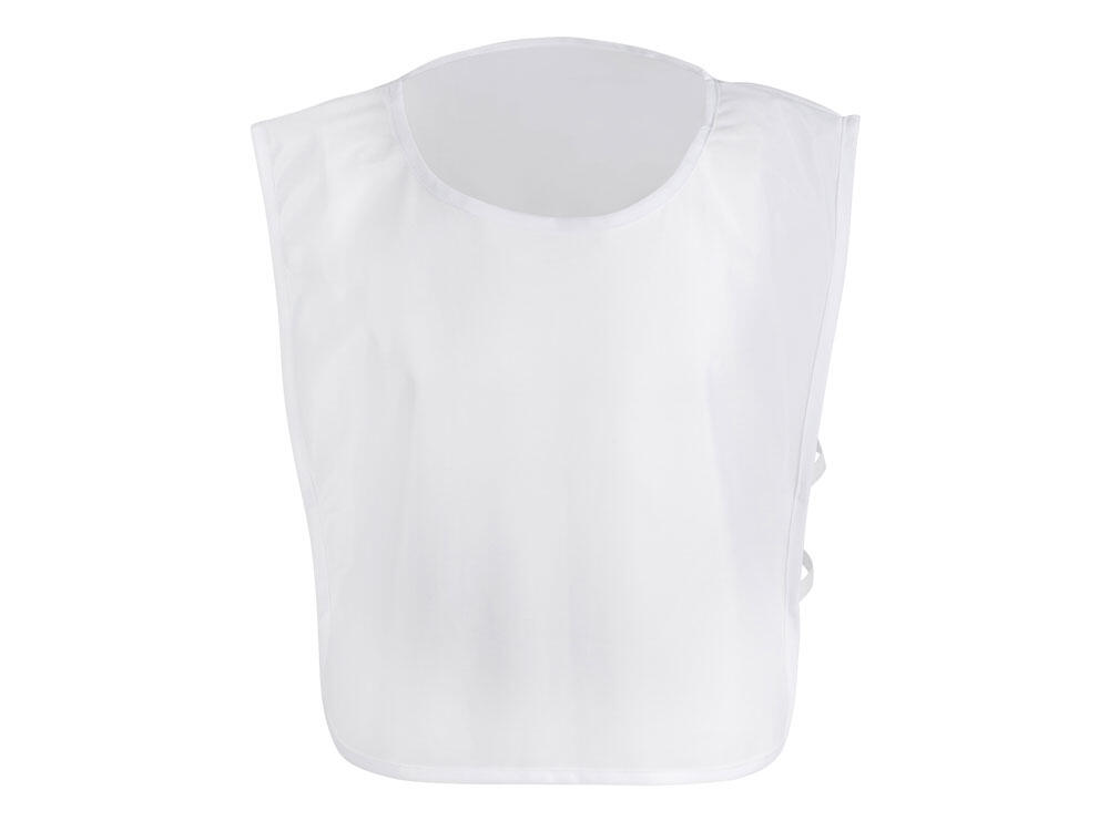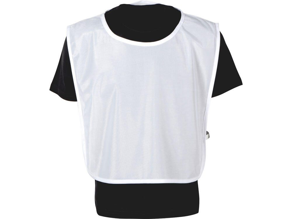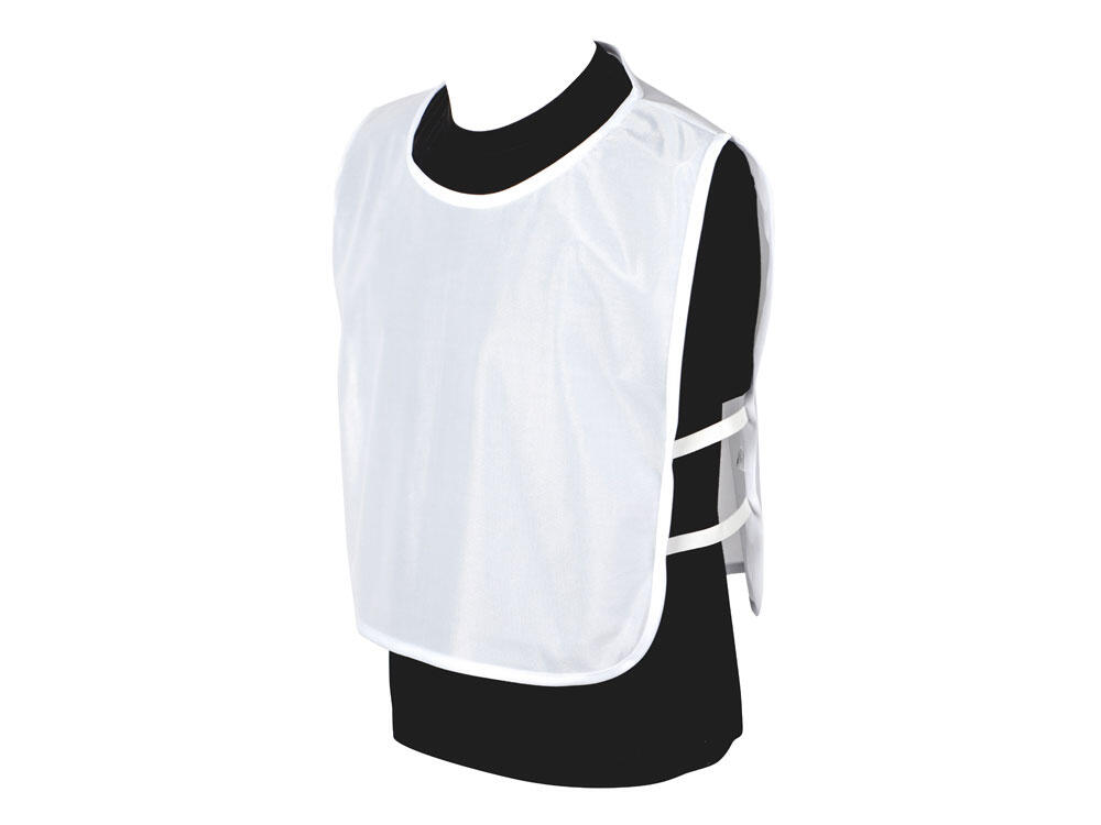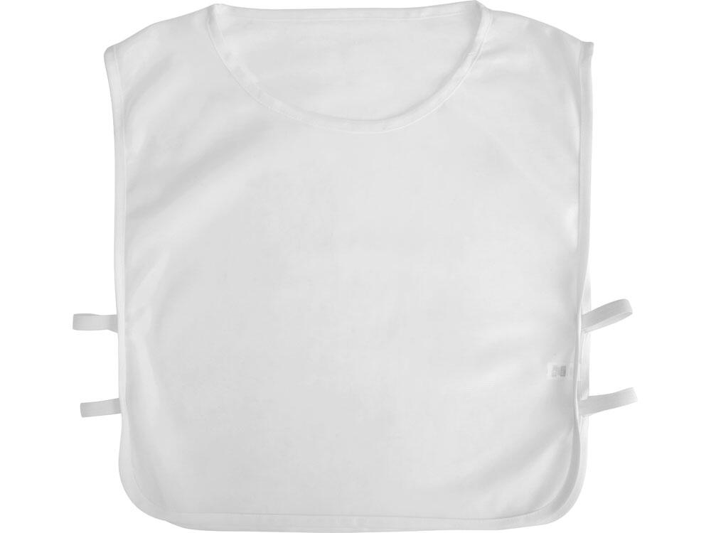 Универсальная спортивная манишка белого цвета. Боковые резинки обеспечивают удобство одевания и снятия. Материал манишки легко стирается и быстро сохнет.