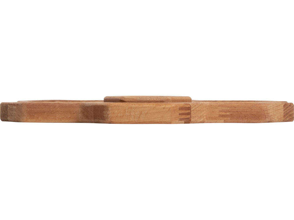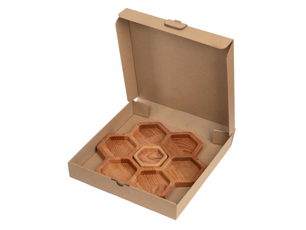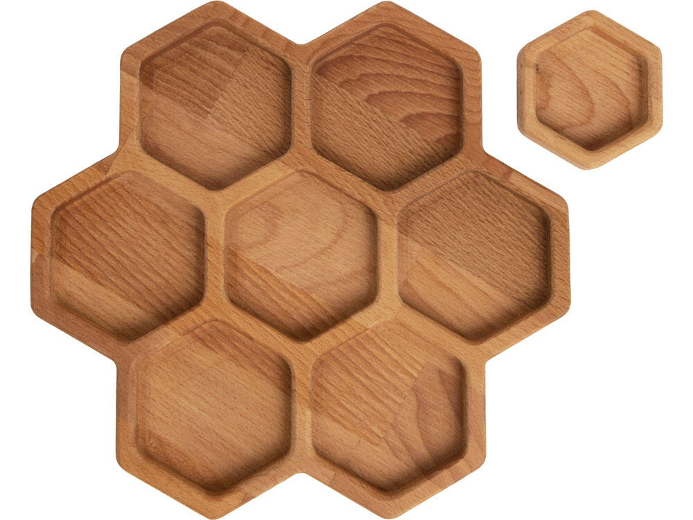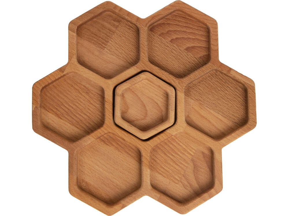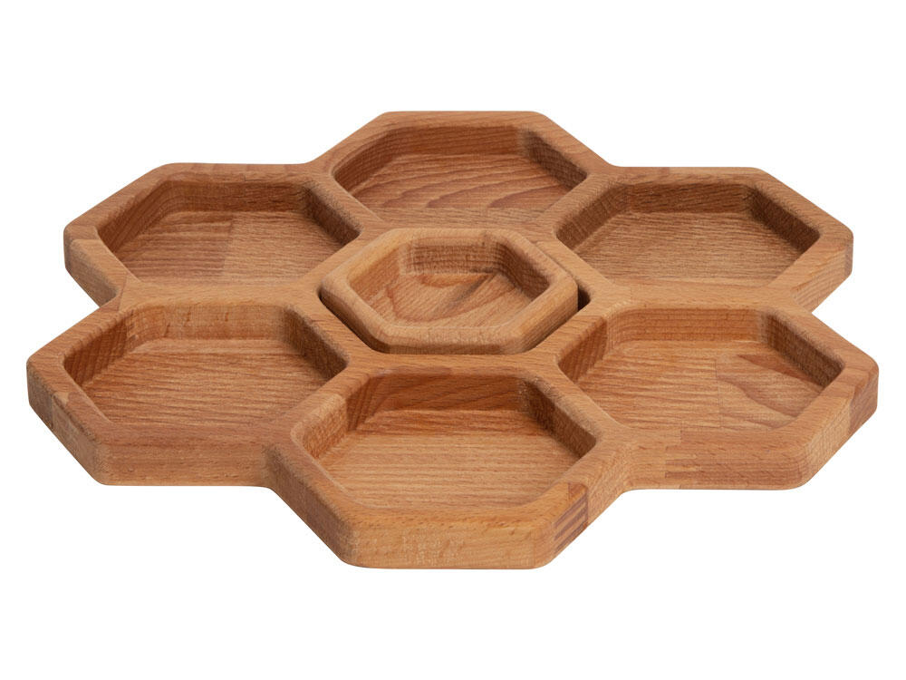 Менажница выполнена в виде семи сот для разных видов закусок — за бонусную дополнительную отвечает съемная сота-соусница, в которую можно залить мед или любимый соус. Менажница выполнена из бука и пропитана маслом, что обеспечивает изделию свежий вид. Советуем регулярно смазывать дерево пищевым маслом, чтобы изделие дольше радовало вас. - натуральный бук - съемная соусница - интересный дизайн - вариант для подачи 8 видов закусок - можно использовать для сервировки закусок