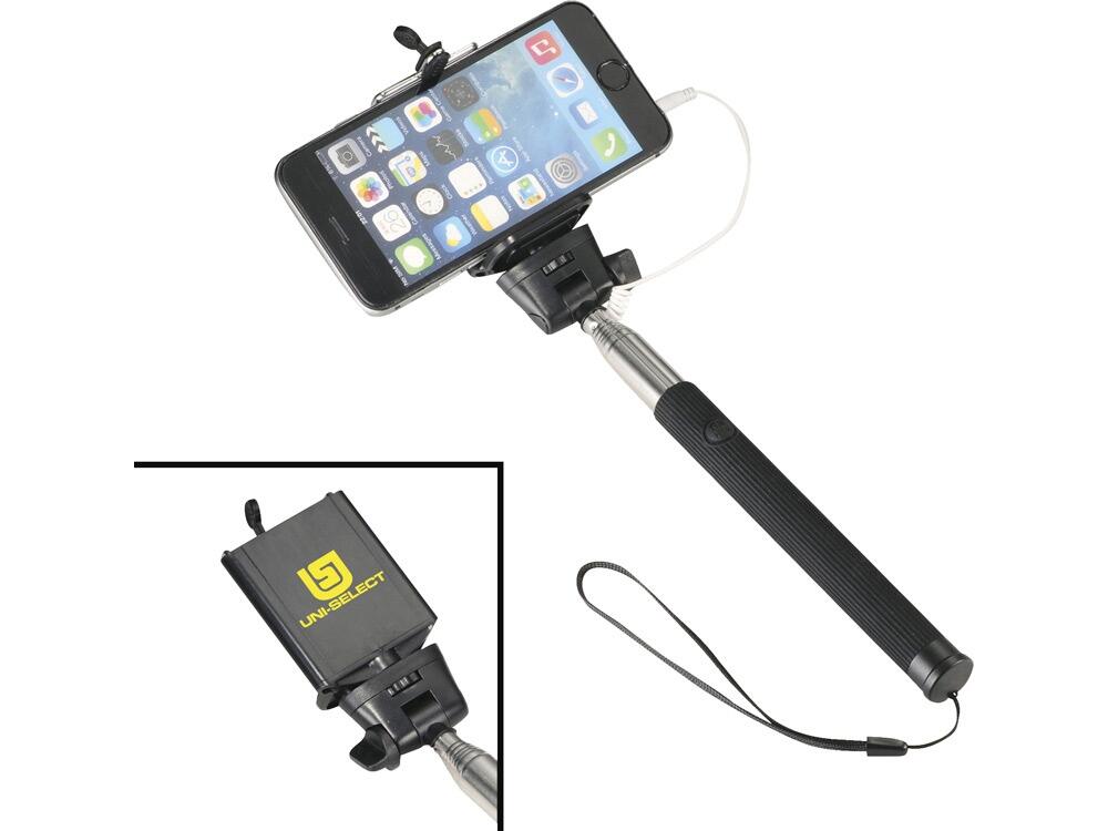 Проводной монопод. Сделайте идеальный селфи с этим выдвижным моноподом (до 90 см). Не требует батареи или использования приложения. Просто подключите 3,5 мм аудио разъем в телефон (совместим только с телефонами, у которых есть разъем 3.5 мм) и нажмите на кнопку, расположенную на ручке. Регулируемый держатель. Силикон, сталь и ПВХ.