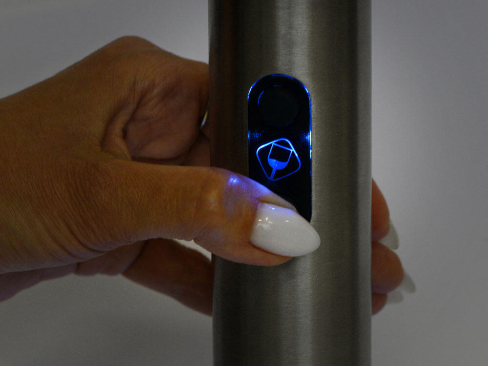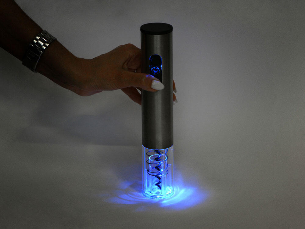 Штопор работает на батарейках АА (4 штуки) и при работе подсвечивается синим, что прекрасно видно сквозь прозрачную нижнюю часть — превратите подготовку вина в настоящее зрелище! От вас не требуется никаких усилий: просто правильно разместите штопор поверх горлышка и нажмите кнопку, а если процесс не кажется вам очевидным — поможет инструкция, которая приложена к набору.