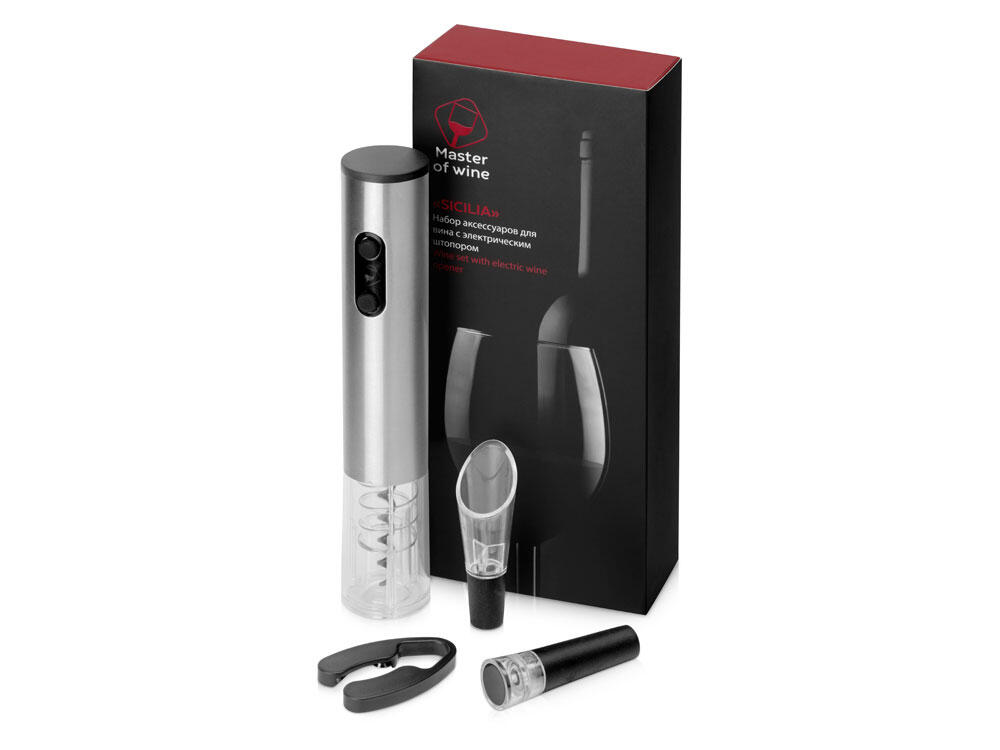 Набор «Sicilia» от Master of Wine состоит из электрического штопора из нержавеющей стали, пробки для вина, аэратора и ножа для фольги — с ним вы сможете откупорить вино и подготовить его к употреблению наилучшим образом.