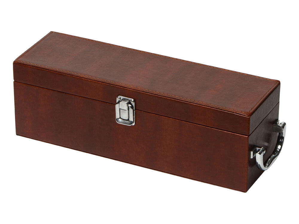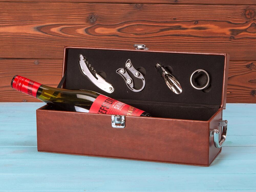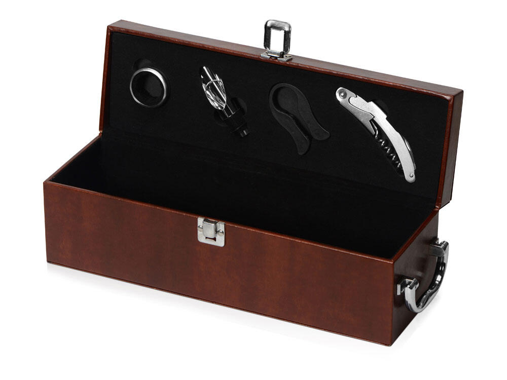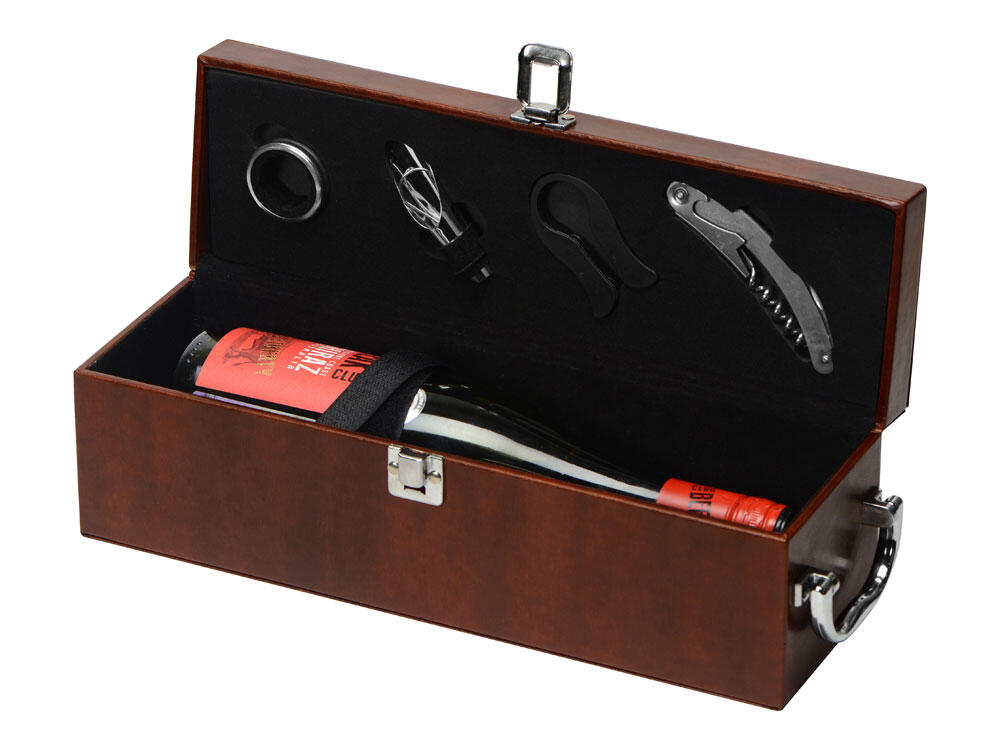 Самое главное — это футляр, в котором находится набор: принадлежности расположились в вырубленных нишах на крышке, а большое основное отделение предназначено для бутылки вина.