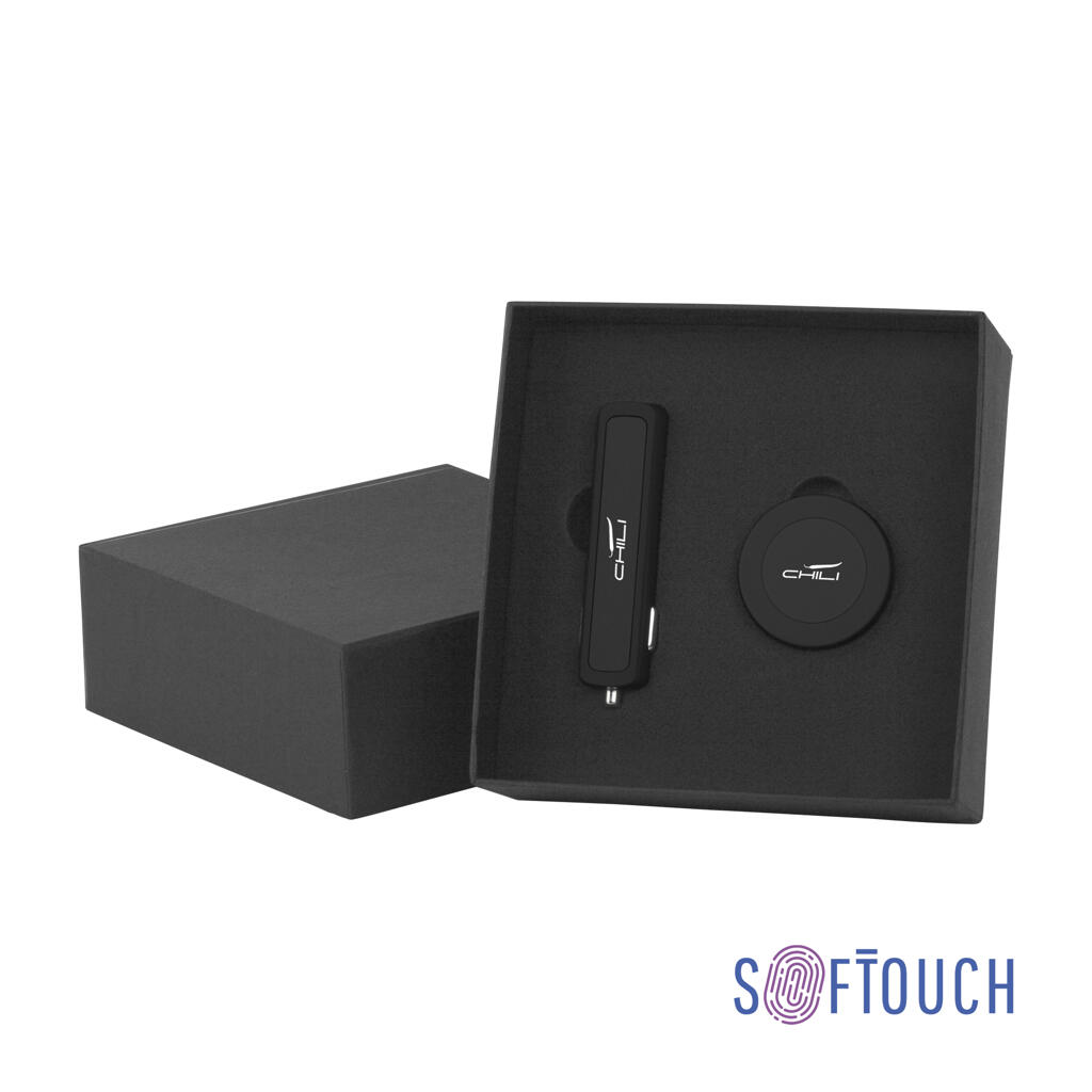 Набор автомобильное зарядное устройство "Slam" + магнитный держатель для телефона "Allo" в футляре, черный, покрытие soft touch