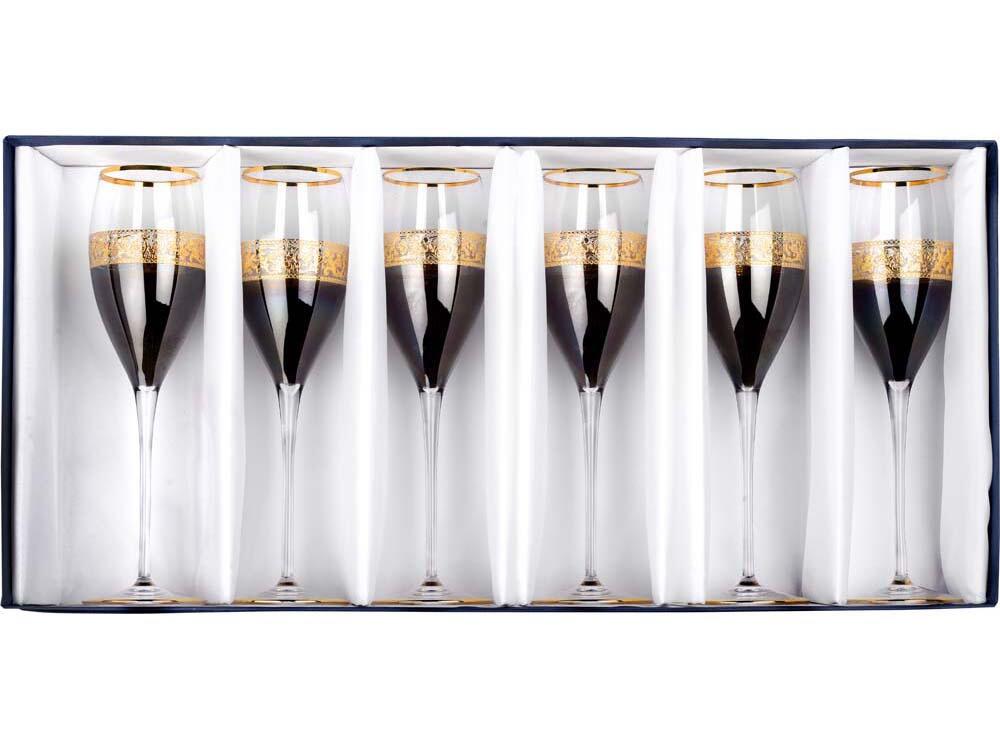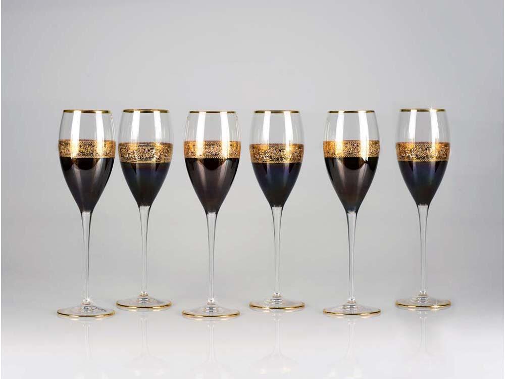 Замечательный набор бокалов для шампанского позволит отметить достижения в бизнесе в кругу партнеров и близких людей. Набор включает в себя 6 бокалов, выполненных из тонкого прозрачного и темного хрусталя с золотым орнаментом.