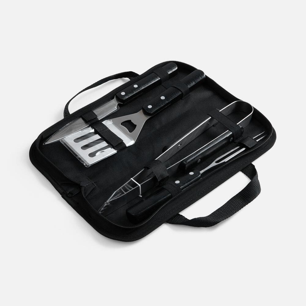 Набор для барбекю Friti — надежный помощник при приготовлении сочных стейков, овощей и других блюд на огне. Продуманная конструкция инструментов обеспечивает комфортное использование и полный контроль над процессом готовки. Деревянные ручки не нагреваются, а еще на них хорошо ложится гравировка. Также прочный пищевой металл легко моется и не деформируется при работе с горячими продуктами и поверхностями. Компактный чехол не только защищает инструменты при хранении, но и позволяет легко транспортировать набор куда угодно — в загородный дом, ближайший парк или на природу. В набор входят: щипцы, вилка, лопатка и нож. Поставляется в чехле из полиэстера.