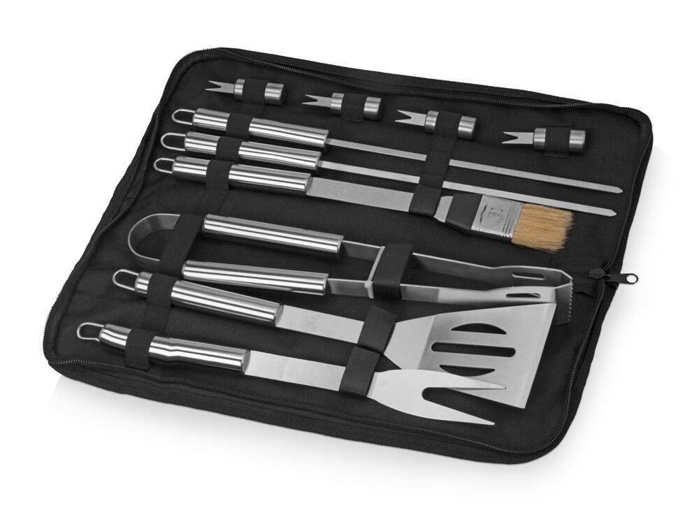 Практичный и функциональный набор для любителей барбекю и шашлыков на природе. В компактной упаковке богатое содержимое: щипцы, лопатка, вилка, кисточка, шампура, шпажки для шашлыка. Прекрасное дополнение ко всем праздникам и посиделкам на природе.